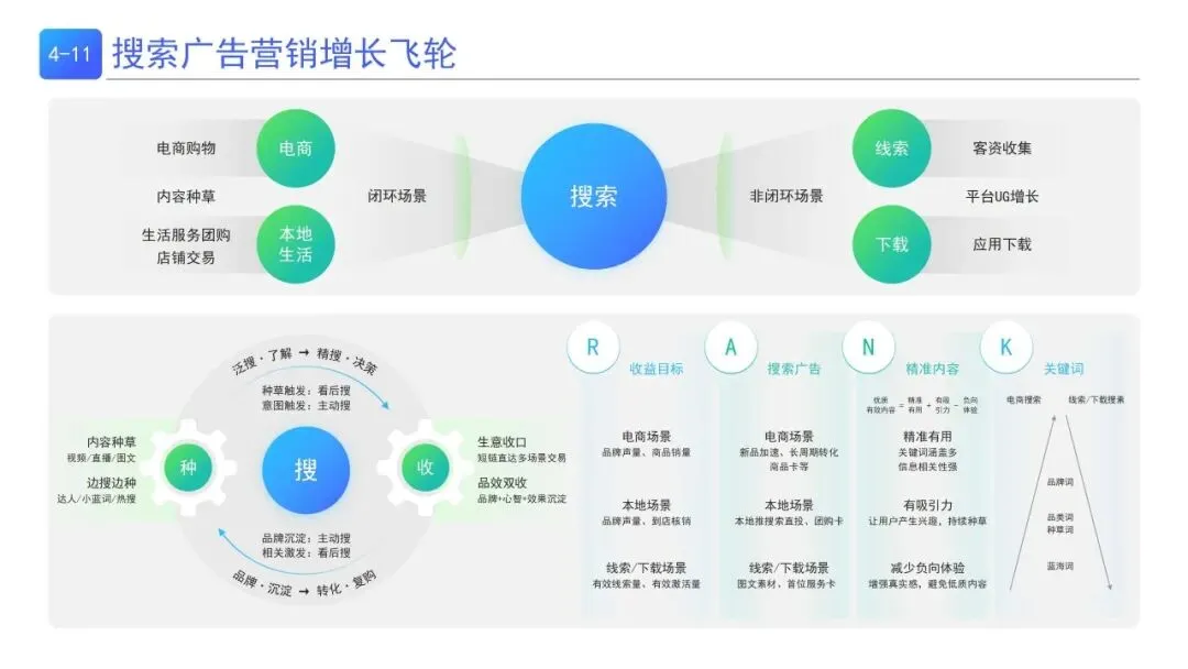 | 以种-搜-收为核心,内容种草触发“看后搜”,精准关键词承接“主动搜”,打通电商/本地生活/线索下载等交易场景,实现品效双收与品牌沉淀 | |