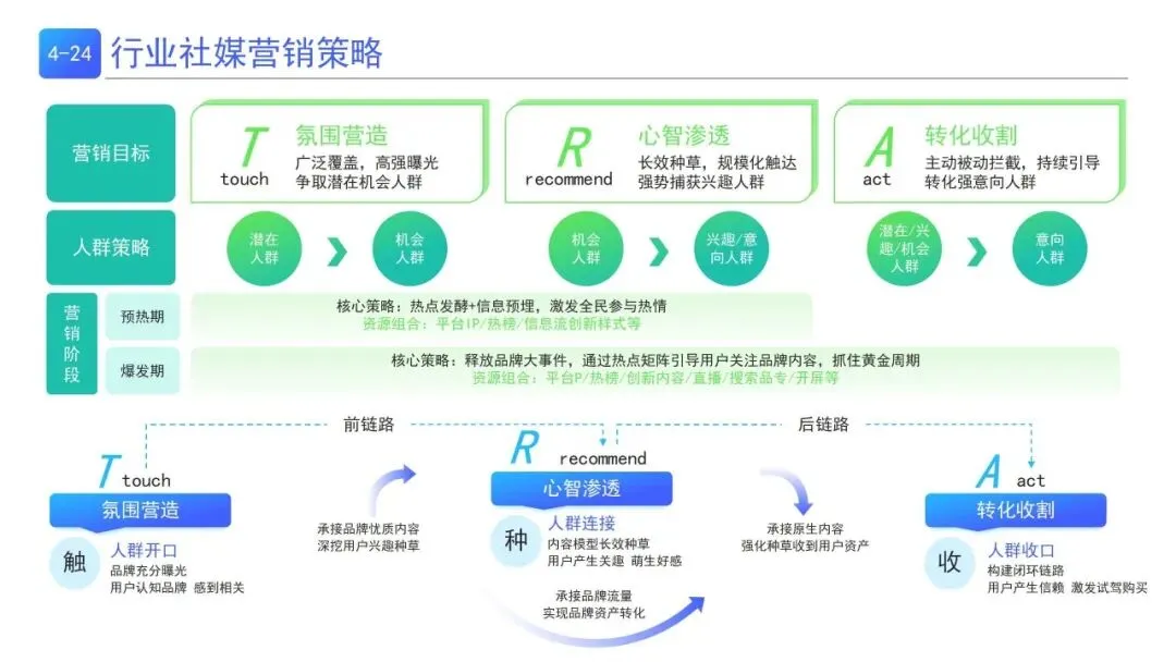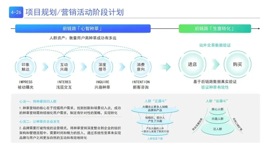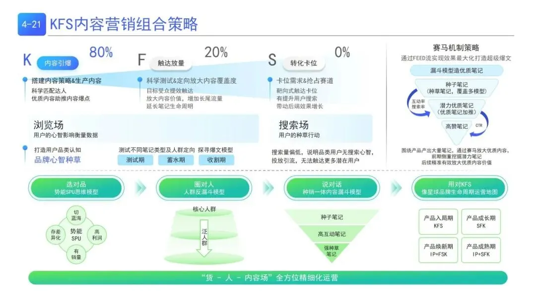 | K(内容引爆)搭建内容体系+匹配达人;F(触达放量)FEED流放大优质内容;S(转化卡位)靶向触达抢占搜索场,结合赛马机制与漏斗模型打造爆文 | |