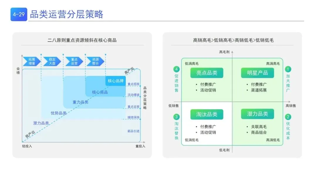 | 遵循二八原则,按销售+毛利将品类分为核心/优势/潜力/淘汰品类,对高产出品类重投入,潜力品类轻投入试错,淘汰品类优化替换,整合资源聚焦核心 | |