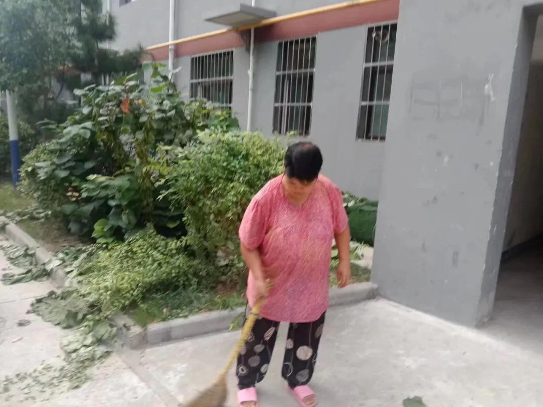 毓秀社区物业工作人员打扫社区公共区域的卫生,营造良好的社区环境。