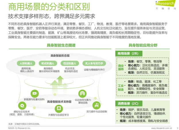 场景分类:分为商用(零售、餐饮等复杂动态场景)、工业(制造、能源等结构化场景)、消费(陪护、教育等轻量化场景)三类,核心能力与技术瓶颈各有侧重。