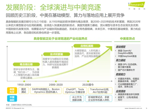 演进历程:历经 1950-2000 年概念萌芽期、2000-2020 年技术积累期,2020 年至今进入大模型驱动的应用拓展期,当前处于产业化临界点。
