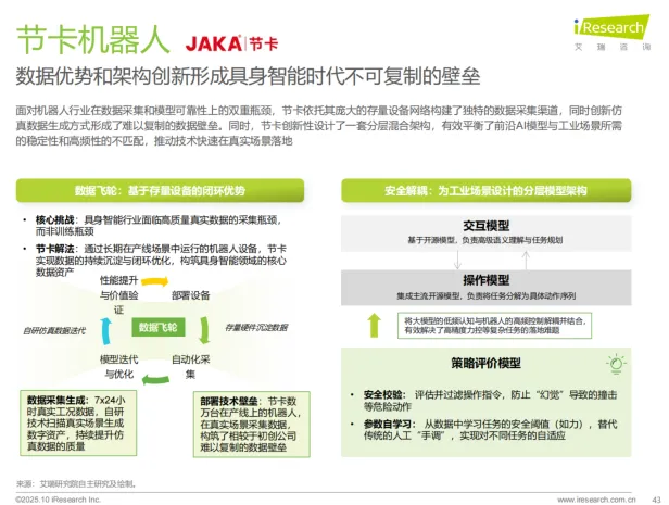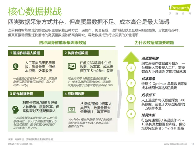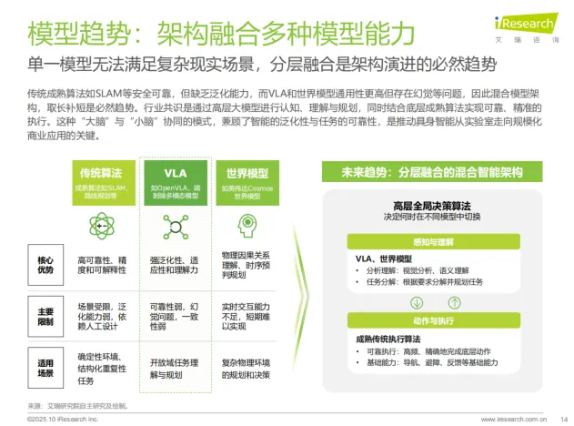 突破方向:通过世界模型、数据采集训练场、便携工具降低数据成本;以 VLA 模型融合多模态能力,采用 “高层大模型 + 底层传统算法” 混合架构提升可靠性。