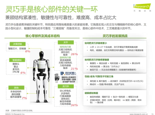 核心挑战:面临数据(高质量实操数据稀缺)、技术(灵巧手精度、Sim2Real 迁移不足)、成本(核心部件占比高)、商业(ROI 周期长、伦理安全待解)四大瓶颈。