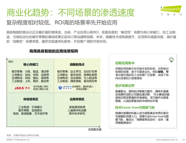 场景渗透节奏:从工业制造、仓储物流等低复杂度、高 ROI 场景切入,逐步向高价值战略性场景拓展,最终实现通用化服务。