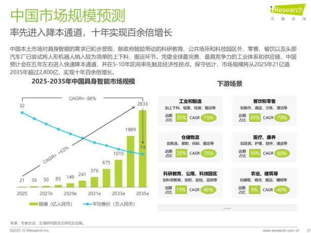 市场规模预测:2025 年全球市场规模 192 亿元,未来五年 CAGR 达 73%,十年内将达万亿级;中国市场 2025 年达 21 亿元,2035 年预计超 2800 亿元,十年增长百余倍。