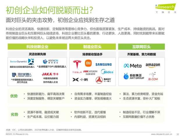 竞争主体:形成三类玩家 ——AI 原生挑战者(Figure 等)、传统机器人头部企业(ABB、擎朗智能等)、跨界巨头(特斯拉、亚马逊等),各有优势与路径侧重。