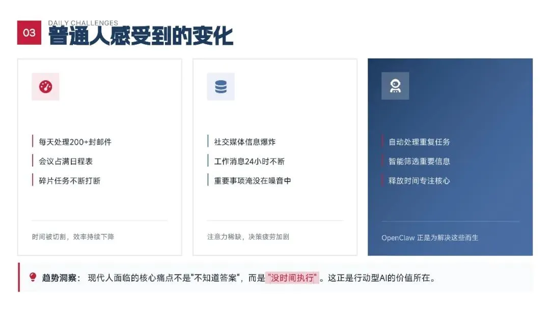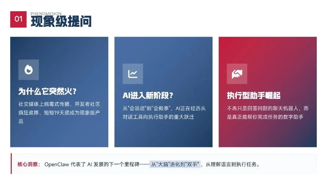 OpenClaw研究报告指出,OpenClaw代表了AI从“大脑”进化到“双手”的下一个里程碑,开启了AI的“行动时代”。它不再是仅能对话的聊天机器人(如ChatGPT),而是能直接执行任务的“行动型AI助手”,如清理邮箱、安排会议、出行值机等,充当用户的“数字分身”、“私人秘书”和“自动化管家”。