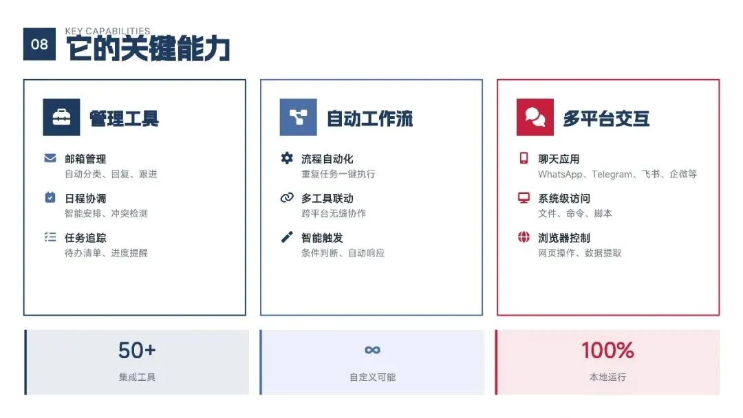 具备管理工具(邮箱、日程、任务追踪)、自动工作流(流程自动化、多工具联动)、多平台交互(集成 50 + 工具、支持聊天应用 / 系统级访问 / 浏览器控制)三大关键能力;秉持 “开放” 理念,代码开源、支持功能自定义与本地运行,数据存储在用户设备,隐私可控且可灵活切换 AI 模型,权限由用户决定。