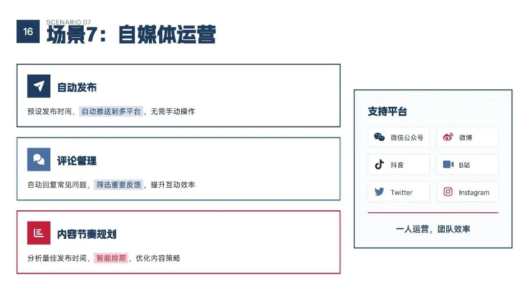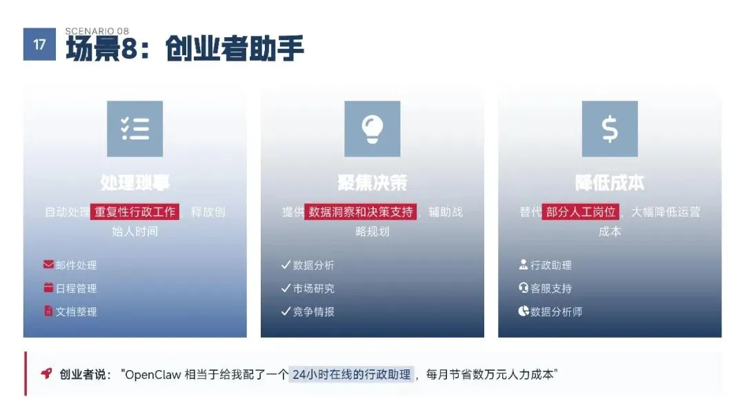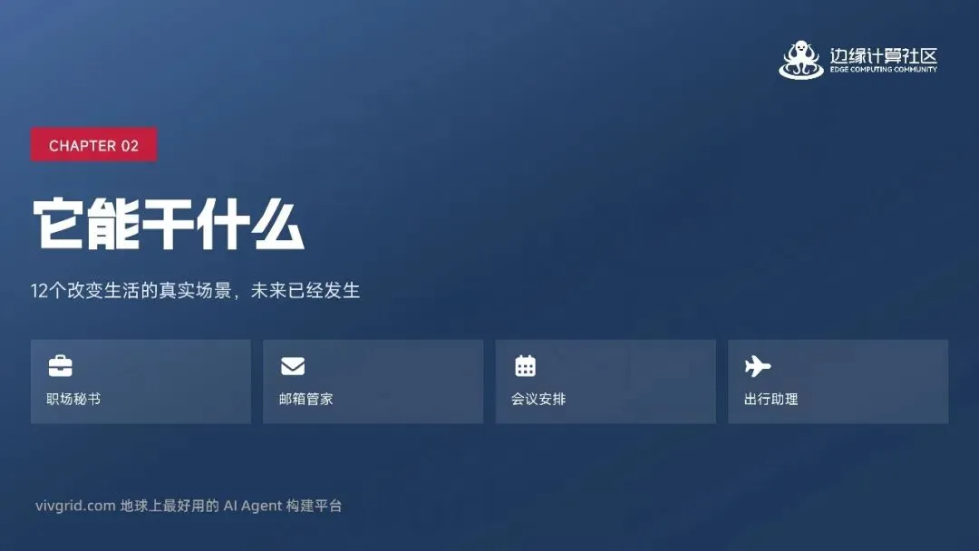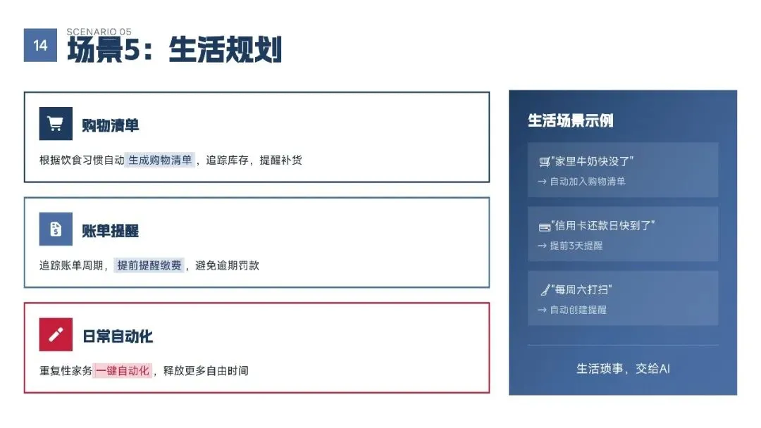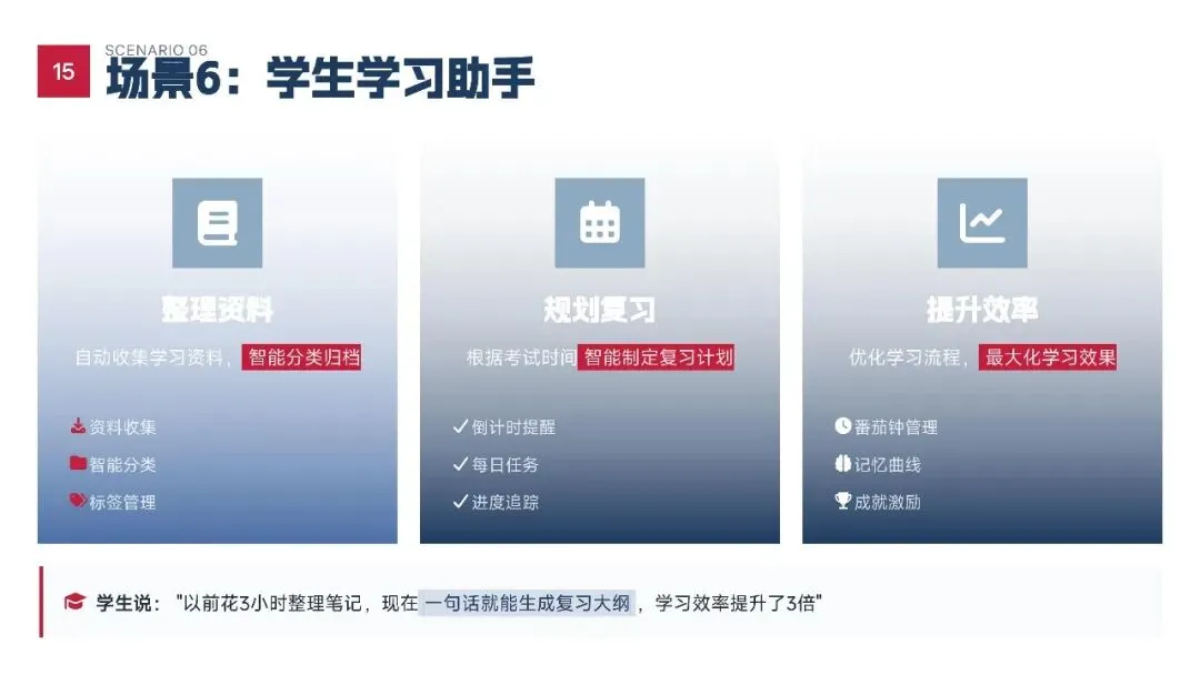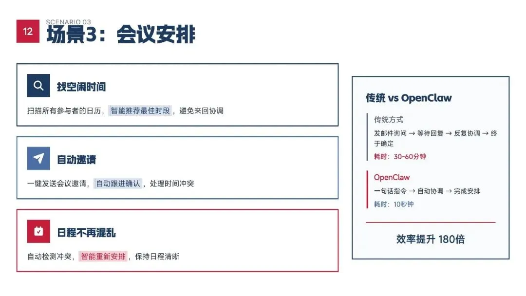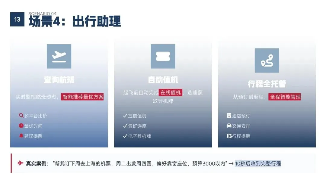 覆盖 12 类生活与工作场景,从职场秘书、邮箱管家、会议安排、出行助理等个人高效办公场景,到学生学习助手、自媒体运营、创业者助手等垂直领域,再到家庭智能管家、医疗养老陪护、企业办公自动化,甚至未来城市系统的智能调度,实现从个人琐事到企业运营、城市管理的全场景赋能,大幅提升效率(如会议安排效率提升 180 倍)。