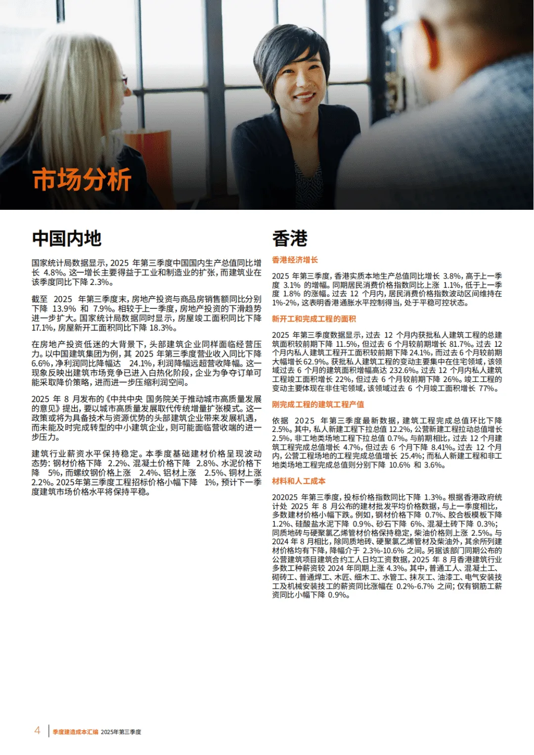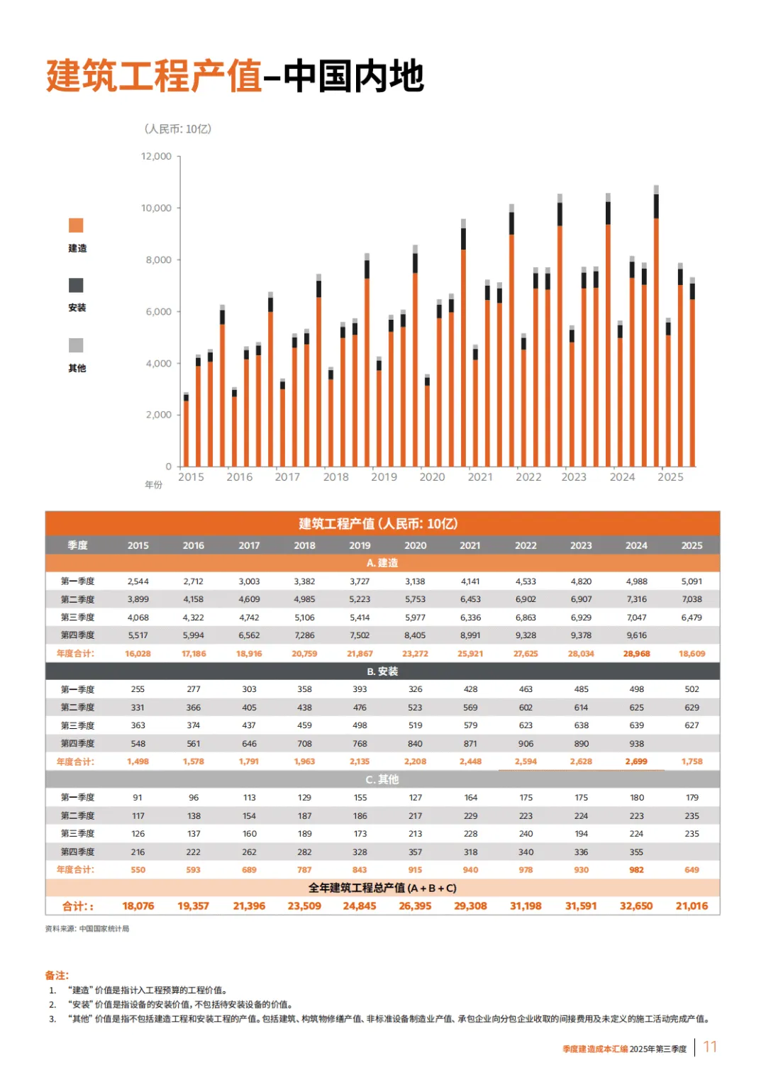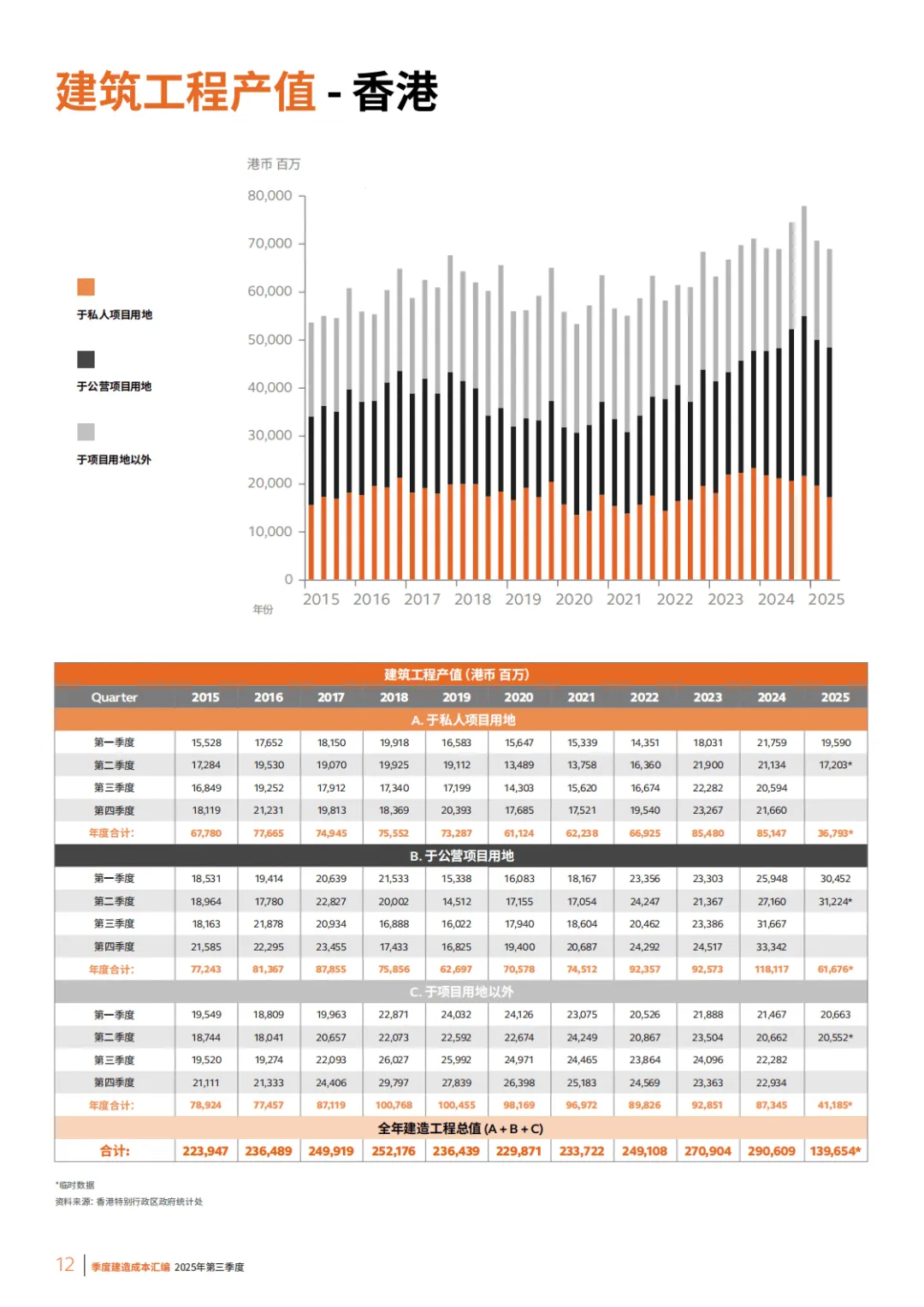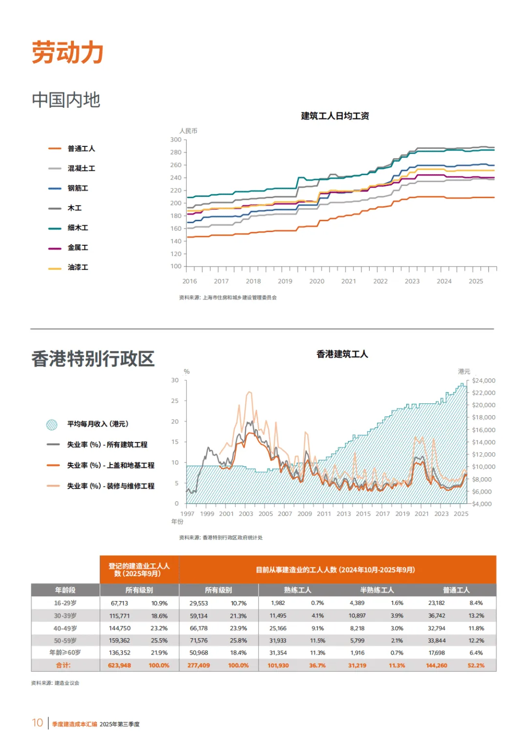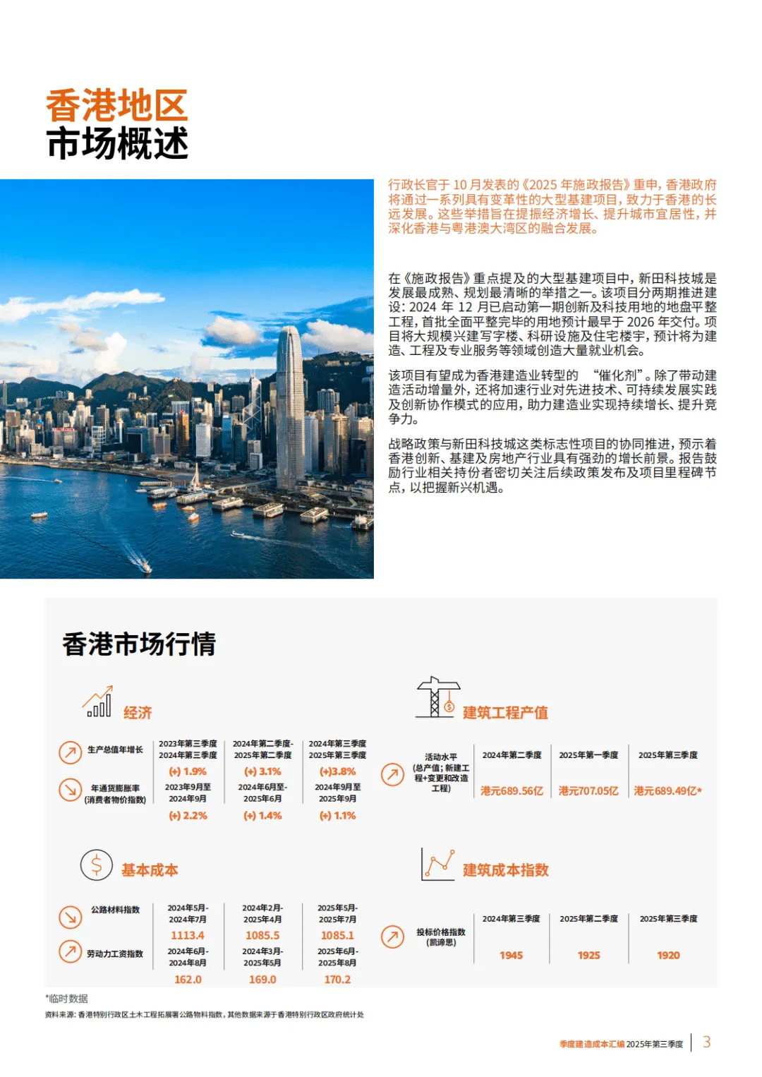 2025年第三季度中国内地与香港地区建筑市场呈现差异化发展态势,建造成本、行业产值、材料及人工价格均出现不同特征,香港依托大型基建项目迎来行业发展机遇,内地则受房地产市场影响面临行业调整,同时亚洲主要城市建造成本也展现出区域差异。