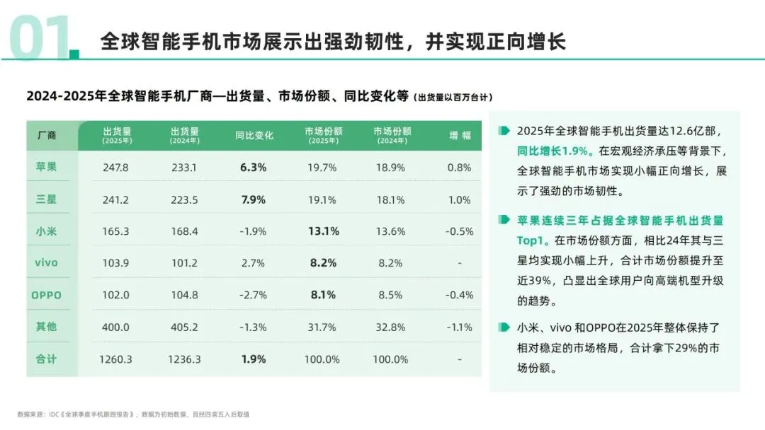 当全球智能手机出货量在高端化浪潮中实现12.6亿部的正向增长,当国产AI应用以DeepSeek、Manus的爆红姿态重塑全球科技版图——2025年的移动互联网行业,正在复杂的经济格局与深刻的范式转移中,展现出惊人的韧性与活力。