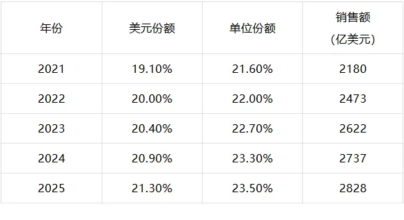 五年间,自有品牌美元销售额增长 +30%,单位销量增长 +4%。