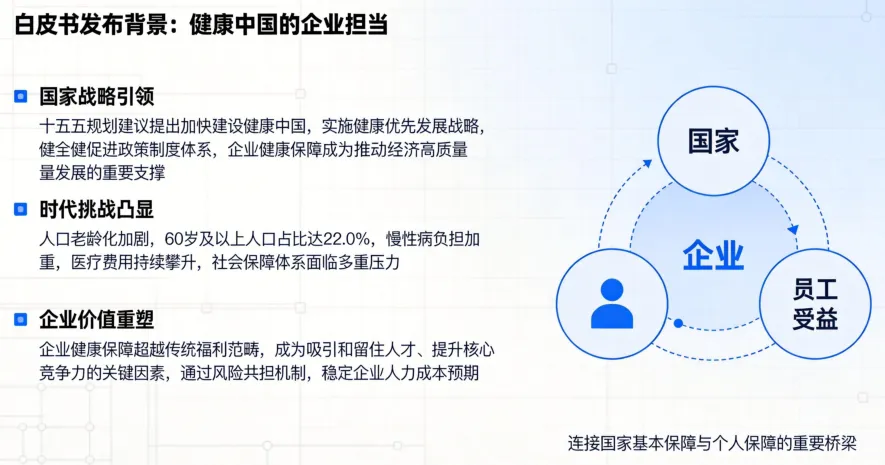 “十五五”规划建议提出加快建设健康中国,为企业健康保障发展指明方向,而我国社会保障体系面临的人口老龄化、慢性病负担加重、医疗费用攀升等挑战,更是让企业健康保障的重要性愈发突出。作为连接国家基本保障与个人保障的重要桥梁,其价值早已超越传统福利范畴,体现在社会、企业、个体三个核心层面。