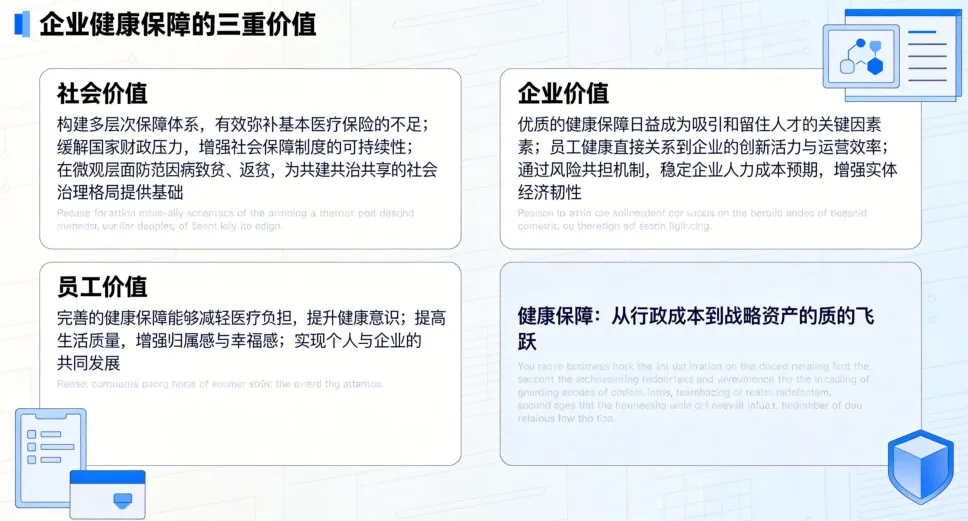 对社会而言,企业健康保障能有效弥补基本医疗保险的不足,缓解国家财政压力,增强社会保障制度的可持续性,同时在微观层面防范因病致贫、返贫,为共建共治共享的社会治理格局筑牢基础。 对企业而言,优质的健康保障是吸引和留住人才的关键抓手,尤其在知识经济时代,员工健康直接关联企业的创新活力与运营效率;同时通过风险共担机制,企业能稳定人力成本预期,增强实体经济韧性。 对员工而言,完善的健康保障不仅能减轻医疗经济负担,更能提升健康意识和生活质量,让员工获得更强的归属感与幸福感,实现个人与企业的共同发展。