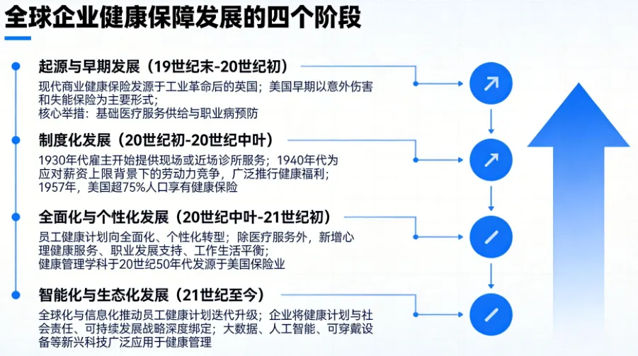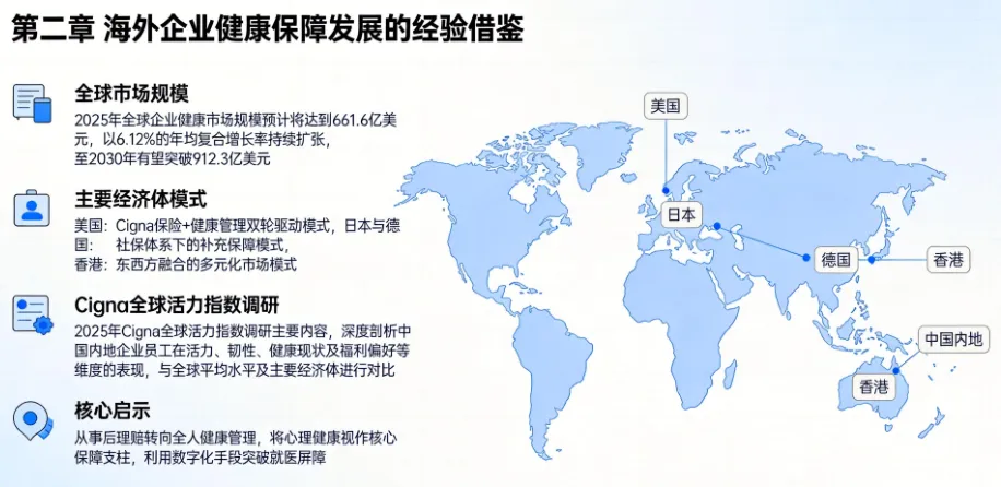 全球企业健康保障发展已历经起源早期、制度化、全面化个性化、智能化生态化四个阶段,美国、日本、德国、中国香港等主要经济体形成了各具特色的发展模式,为中国市场提供了重要借鉴,而2025年Cigna(信诺)全球活力指数调研,则进一步为本土化实践提供了量化参考。