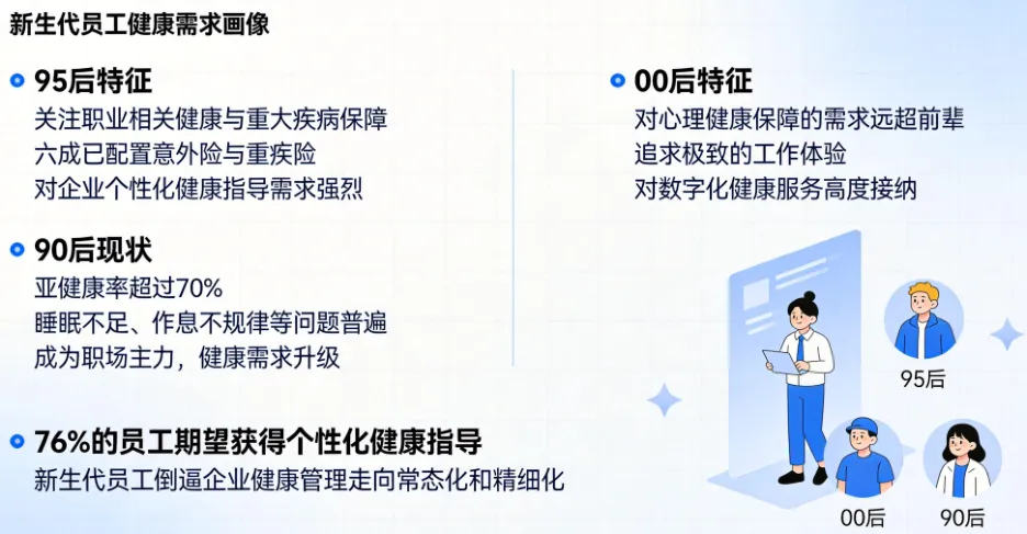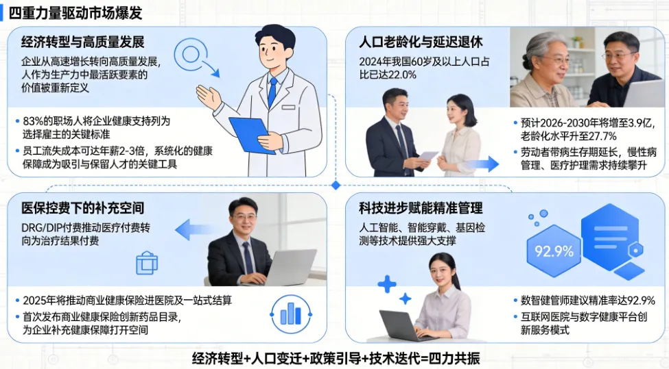 经济转型与企业高质量发展的内在要求:随着中国经济从高速增长转向高质量发展,“人”作为生产力中最活跃要素的价值被重新定义。数据显示,83%的职场人将“企业健康支持”列为选择雇主的关键标准,76%期望获得个性化健康指导,而员工流失成本可达年薪2-3倍,系统化的健康保障成为企业吸引、保留人才的核心工具。同时,新生代员工成为职场主力,90后亚健康率超70%,95后关注重大疾病保障,00后对心理健康的需求远超前辈,倒逼企业健康管理走向常态化、精细化。 人口老龄化与延迟退休的必然趋势:2024年我国60岁及以上人口占比已达22.0%,预计2026-2030年将增至3.9亿,老龄化水平升至27.7%。延迟退休政策实施后,劳动者“带病生存期”延长,慢性病管理、医疗护理需求持续攀升,心脑血管疾病等慢性病成为主要健康负担,预计2030年我国慢性病疾病负担将增长至少40%,这要求企业必须重视员工全周期健康管理。 医保控费下的补充空间与政策引导:医保支付方式改革(DRG/DIP付费)强化控费导向,同时政策鼓励医保与商保融合,2025年推动商业健康保险进医院及“一站式”结算,首次发布商业健康保险创新药品目录,为企业补充健康保障打开全新空间,企业可围绕专科化、垂直化需求开发定制化健康管理产品。 科技进步赋能精准健康管理:人工智能、智能穿戴、基因检测等技术为健康管理提供强大支撑,AI可实现健康数据实时监测、定制体检方案、优化导检路径,数智健管师建议精准率达92.9%;互联网医院、数字健康平台实现报告解读与个性化管理,基因检测则助力搭建“检测-干预-保障”的数字化健康闭环,大幅提升健康管理效率与精准度。