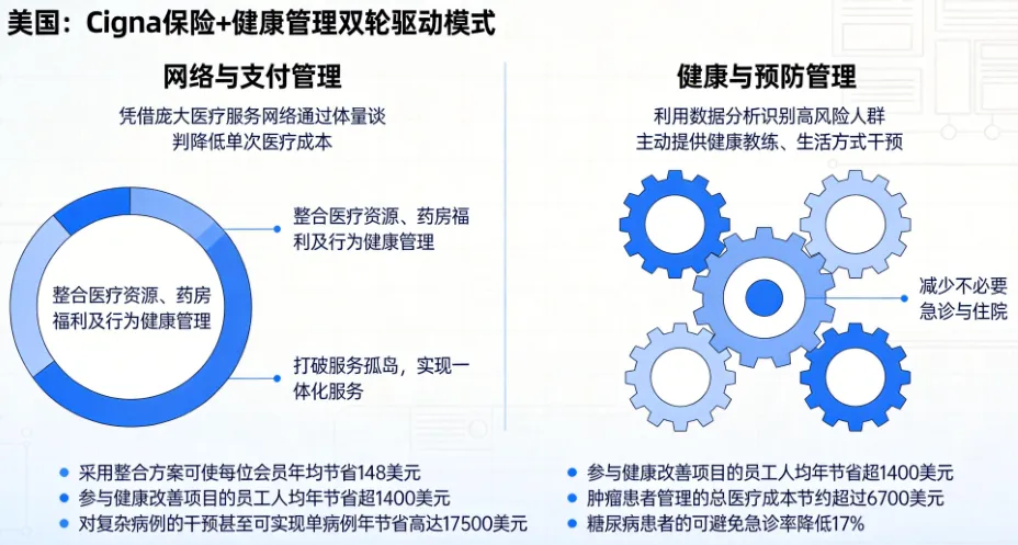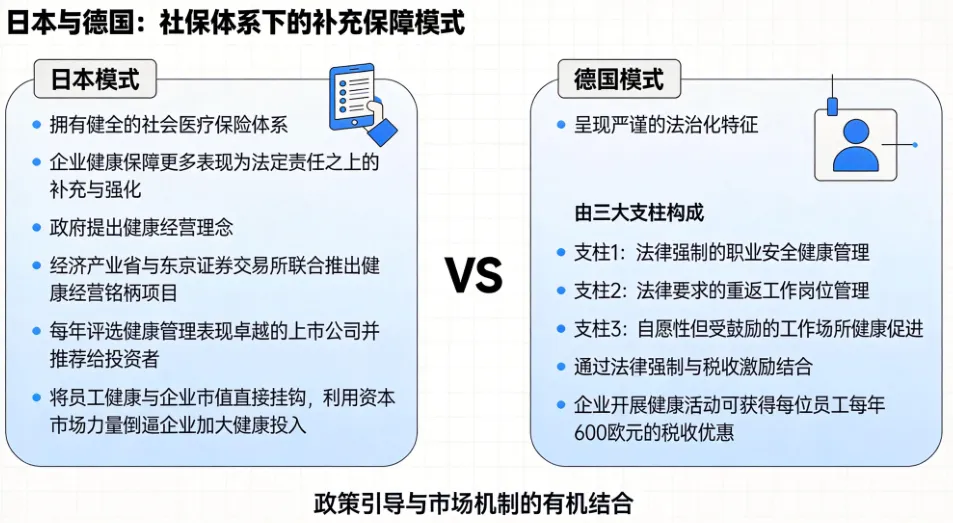 美国:“保险+健康管理”双轮驱动的管理式医疗:以Cigna(信诺)为代表,将医疗保险、药房福利管理和行为健康服务深度融合,保险公司深度介入医疗服务全过程,通过“网络与支付管理”降低单次医疗成本,通过“健康与预防管理”减少不必要医疗支出,数据显示,整合方案能为每位会员年均节省148美元,对复杂病例的干预年节省可达17500美元。 日本、德国:社保体系下的补充保障模式:日本推出“健康经营铭柄”项目,将员工健康与企业市值挂钩,利用资本市场倒逼企业加大健康投入;德国通过法律强制+税收激励,构建职业安全健康管理、重返工作岗位管理、工作场所健康促进三大支柱,企业开展健康活动可获每位员工每年600欧元税收优惠。 中国香港:东西方融合的多元化市场模式:公私双轨并行,团体医疗险主要将员工分流至私立系统获得便捷服务,中医服务被纳入医保计划,同时面对医疗通胀压力,85%的雇主将医保覆盖至合同工,但心理健康服务存在明显供需错配,成为未来福利改革重点。