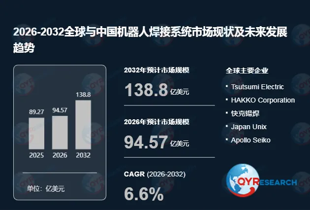根据QYR(恒州博智)的统计及预测,2025年全球机器人焊接系统市场销售额达到了89.27亿美元,预计2032年将达到138.8亿美元,年复合增长率(CAGR)为6.6%(2026-2032)。