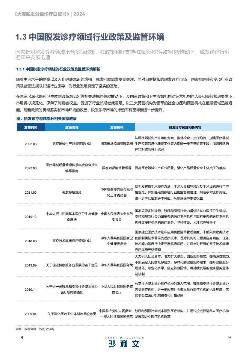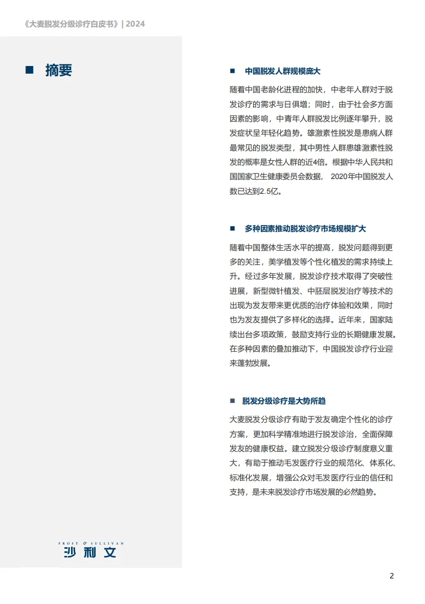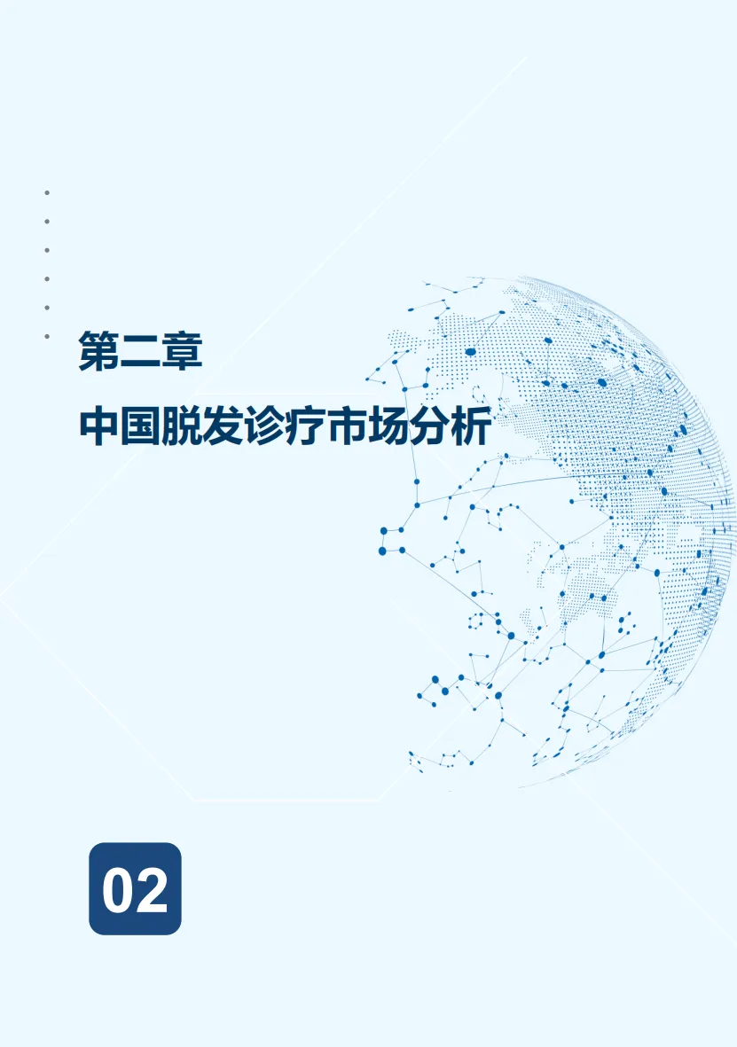 随着中国老龄化进程的加快,中老年人群对于脱发诊疗的需求与日俱增;同时,由于社会多方面因素的影响,中青年人群脱发比例逐年攀升,脱发症状呈年轻化趋势。雄激素性脱发是患病人群最常见的脱发类型,其中男性人群患雄激素性脱发的概率是女性人群的近4倍。根据中华人民共和国国家卫生健康委员会数据,2020年中国脱发人数已达到2.5亿。