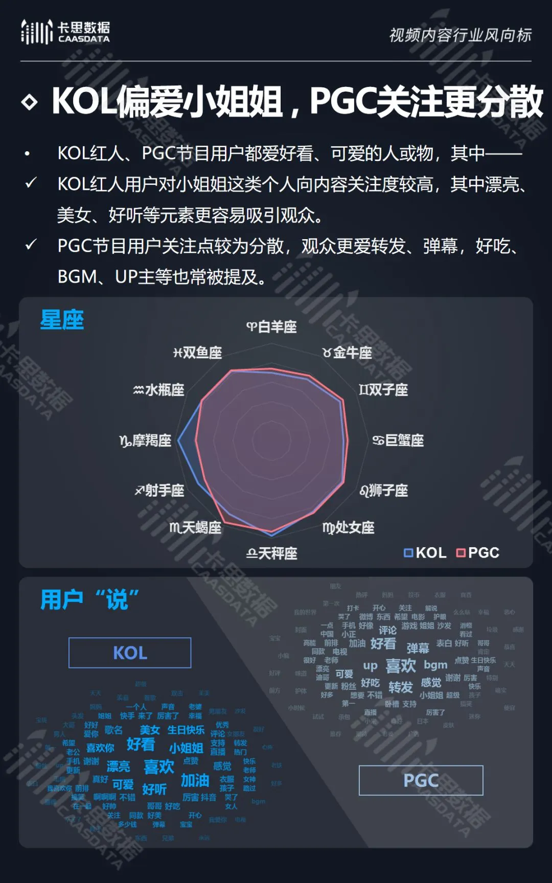 2018年,整个短视频领域用户规模快速扩张,其中KOL红人领域月增速接近 12%,明显超出行业平均水平。KOL红人用户规模占比常态超过 8成,PGC内容则稍显沉寂。在用户画像方面,KOL和PGC两种内容形态的用户都偏女性。25岁以下是主力军,KOL红人用户更为低龄化。PGC节目用户更偏一二线城市,KOL红人用户向三四线下沉。KOL红人用户对小姐姐关注度较高,PGC节目用户关注点比较分散,观众更爱转发、发弹幕。