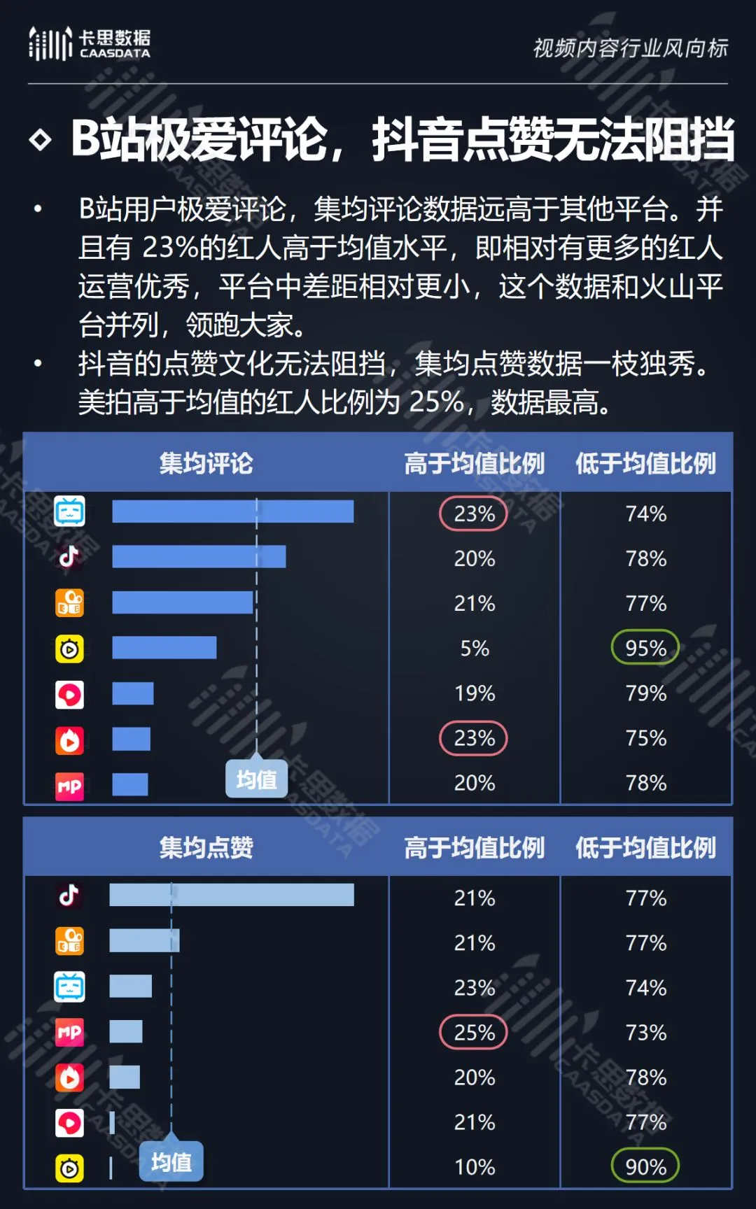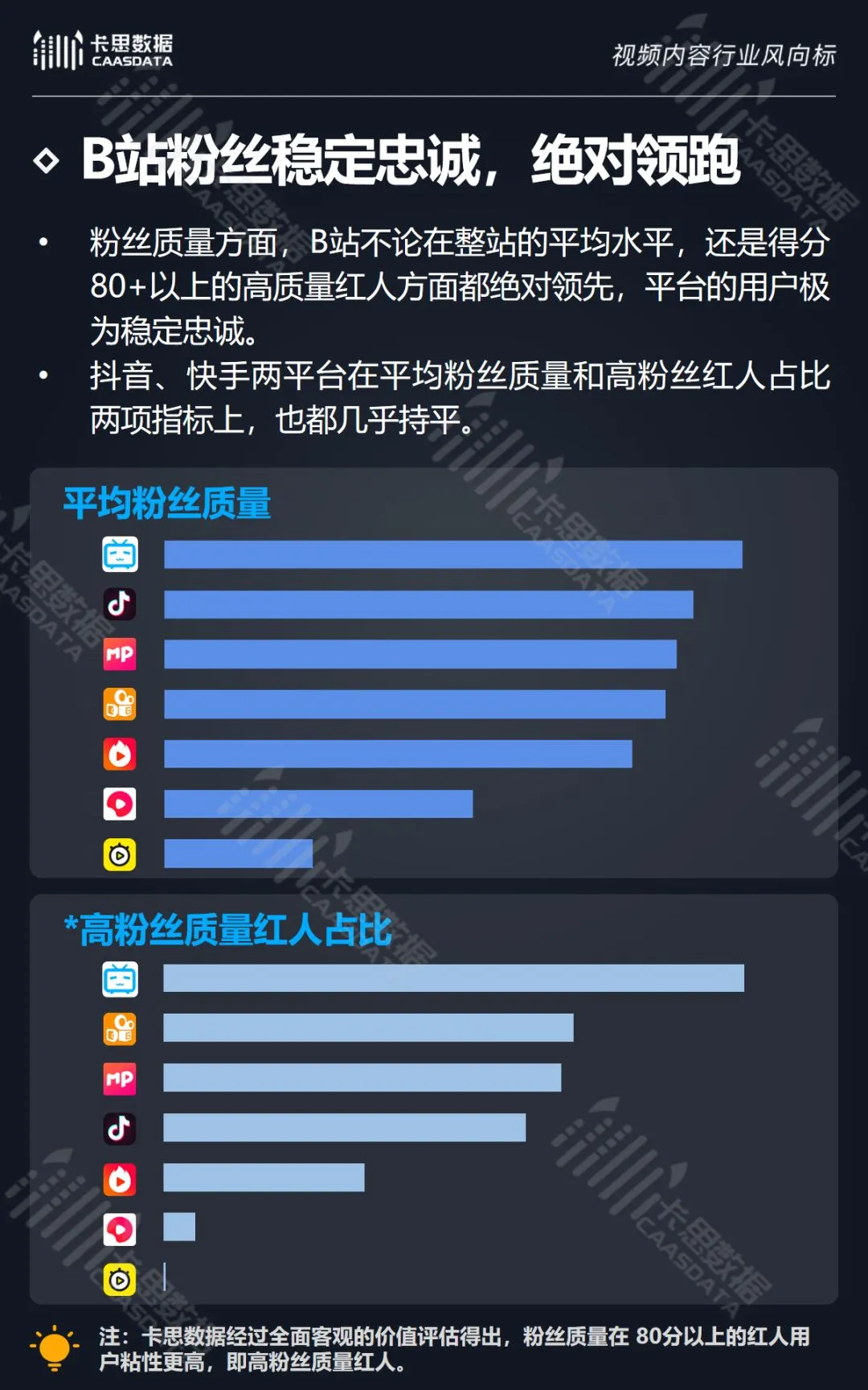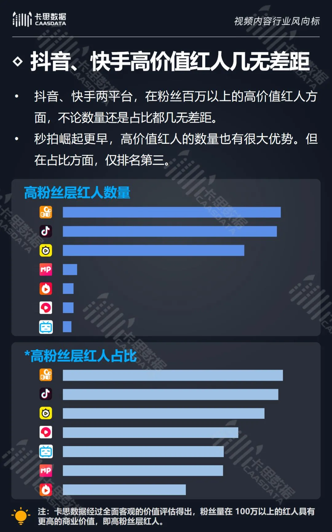 通过对比7大KOL短视频平台,卡思数据发现,在粉丝数量方面,抖音、快手的高价值红人数量和占比都几无差距。秒拍崛起更早,在高价值红人数量方面也很有优势,但占比仅排名第三。在粉丝质量方面,B站粉丝稳定忠诚,以绝对优势领先。抖音、快手两平台在平均粉丝质量和高粉丝红人占比两项指标上基本持平。在互动度方面,B站用户极爱评论,抖音的点赞文化已成为平台特色。