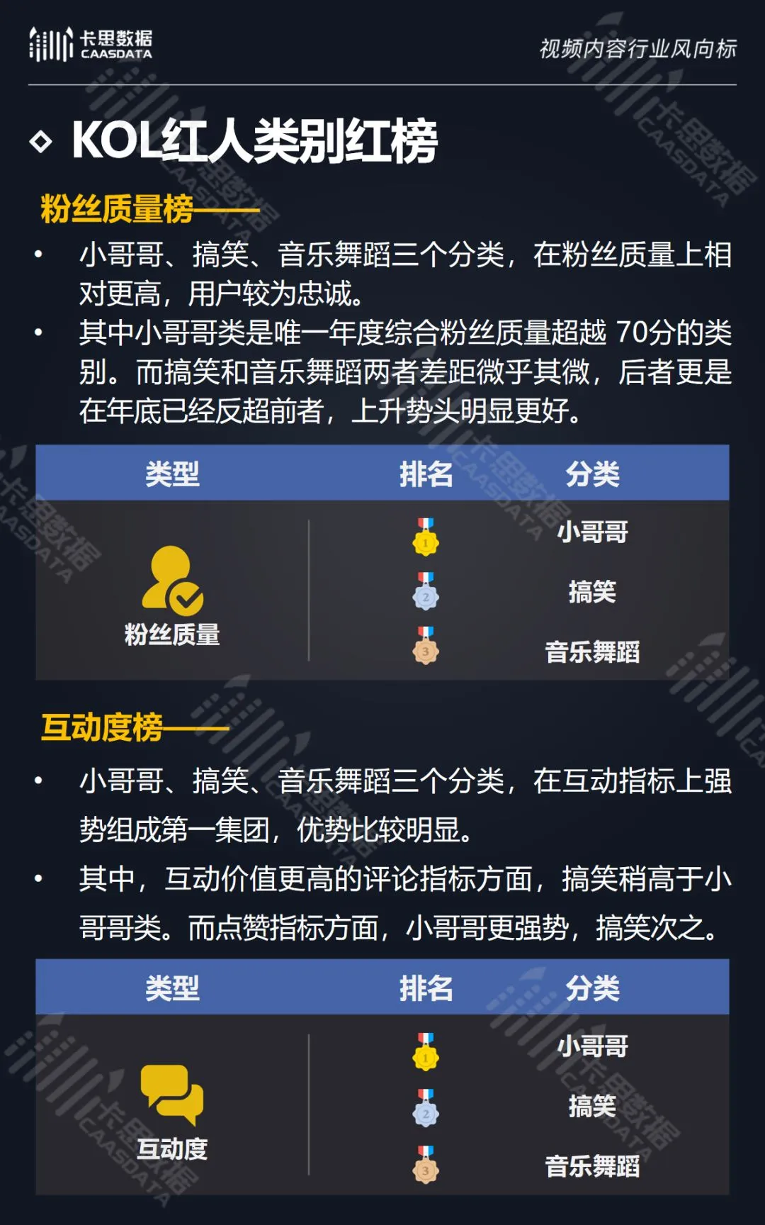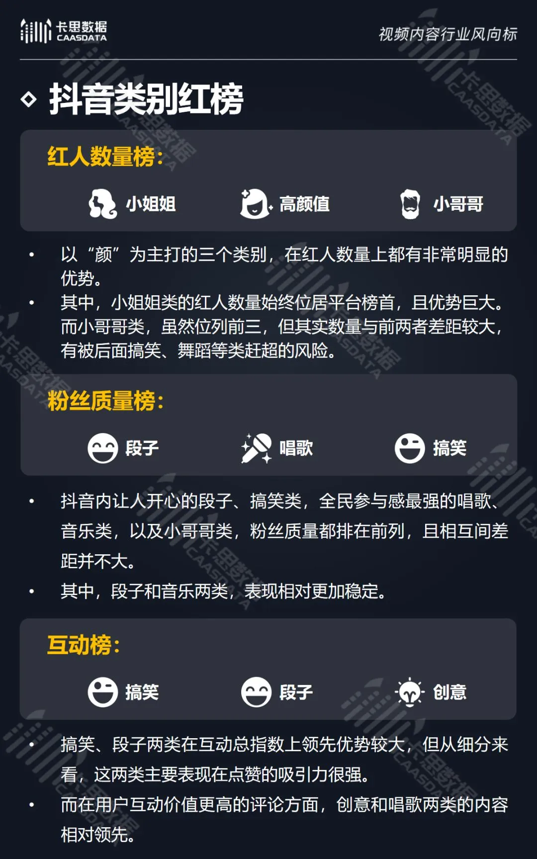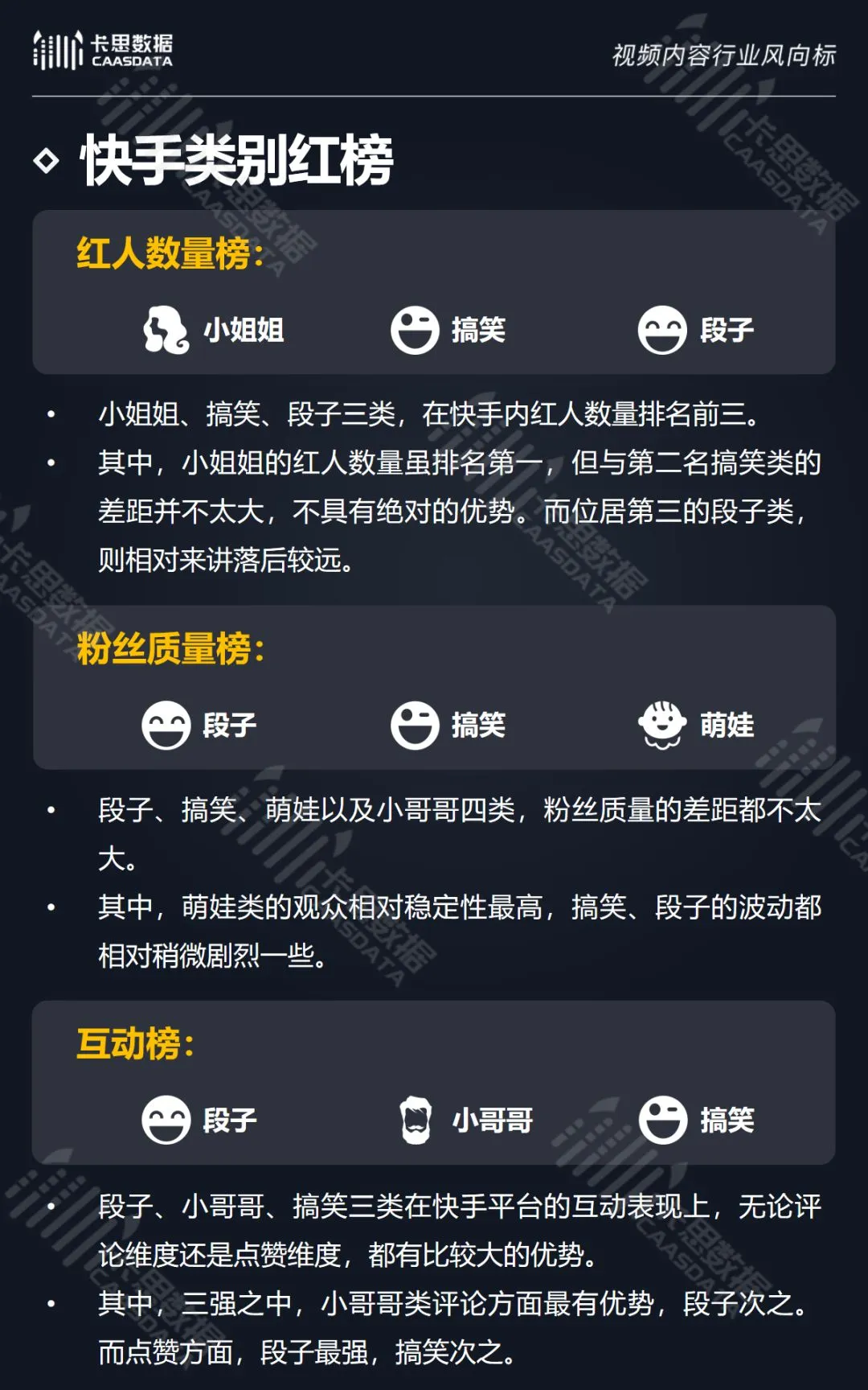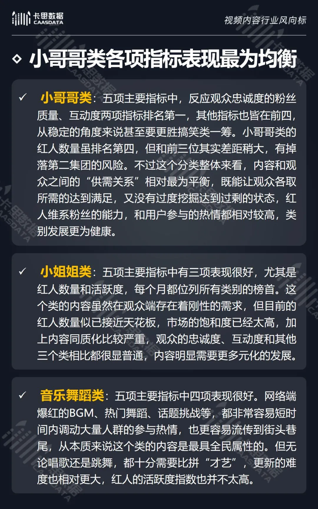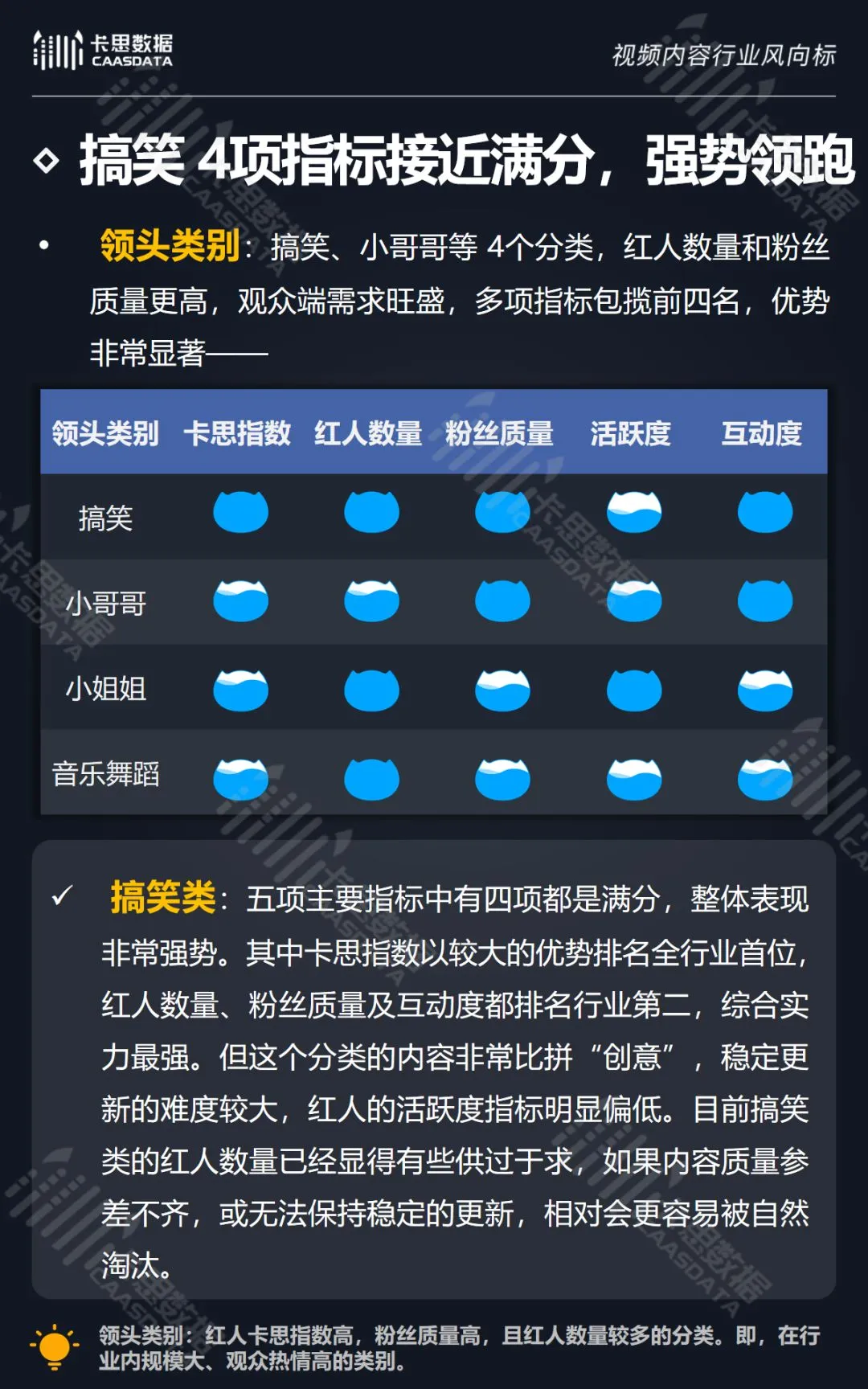 在14个内容分类中,搞笑、音乐舞蹈、小哥哥、小姐姐4类红人的数量和卡思指数在全行业领先。搞笑类四项指标(卡思指数、红人数量、粉丝质量、互动度)接近满分,强势领跑。小哥哥类各项指标表现最为均衡。萌娃萌宠、游戏、美食3类提升空间较大。而用户需求较小的垂类,红人数量少,优质内容严重不足。