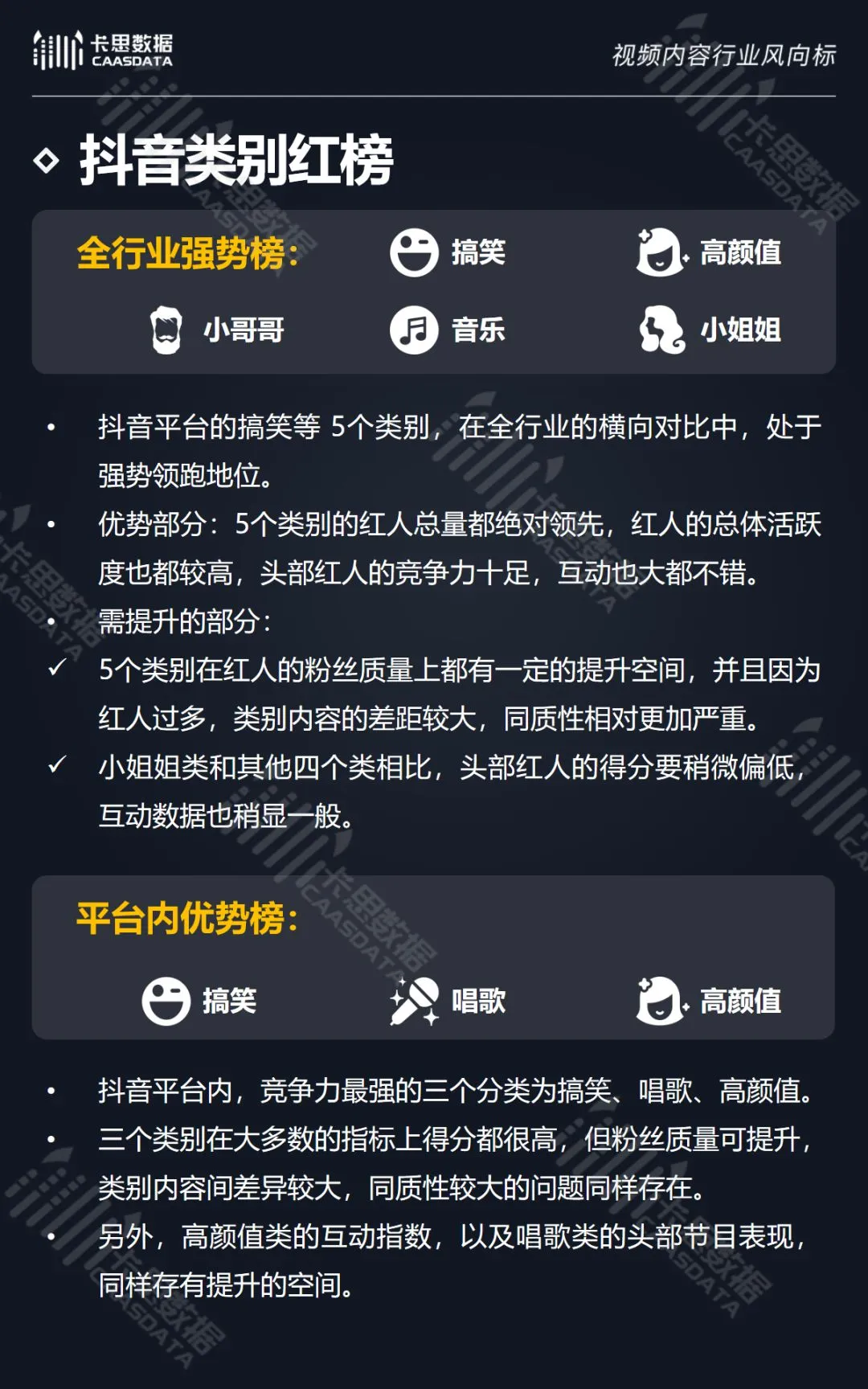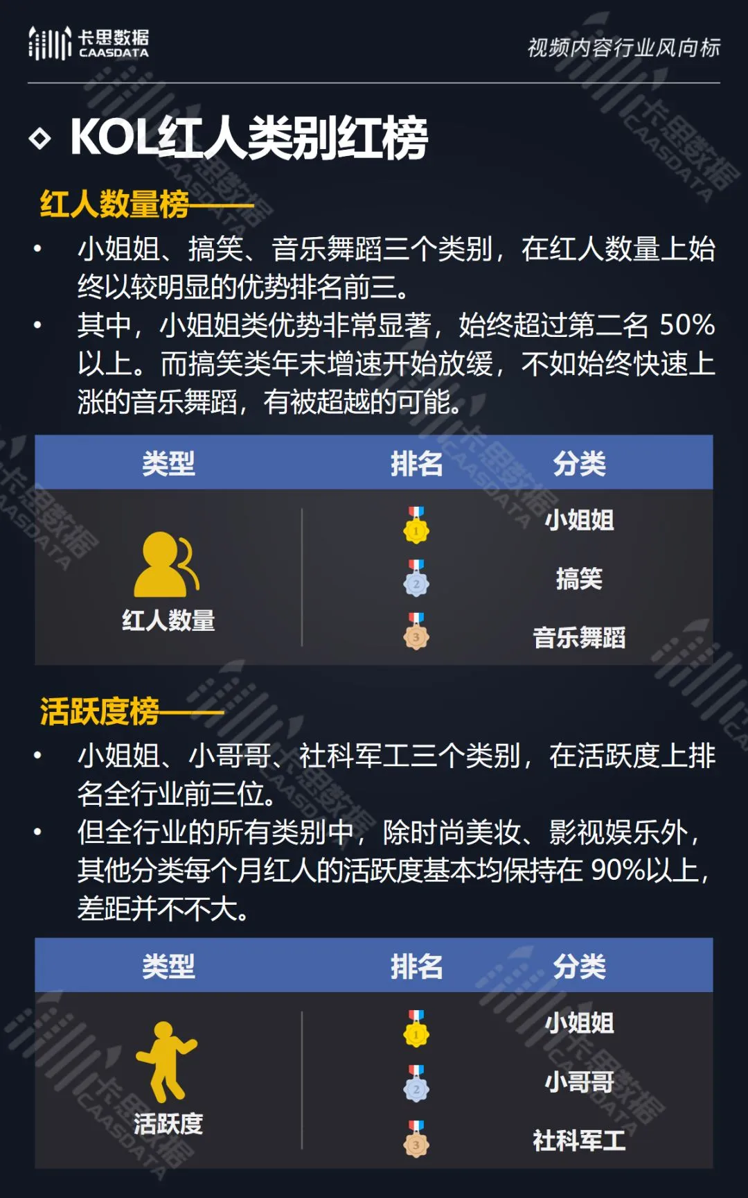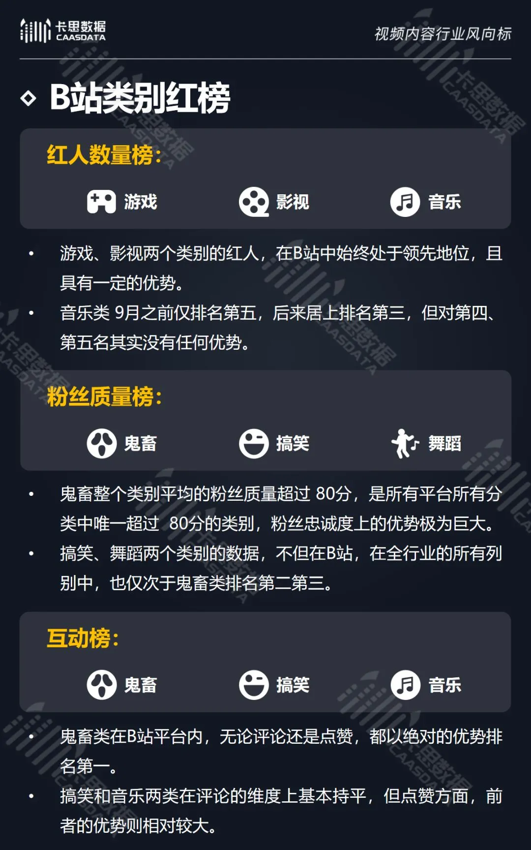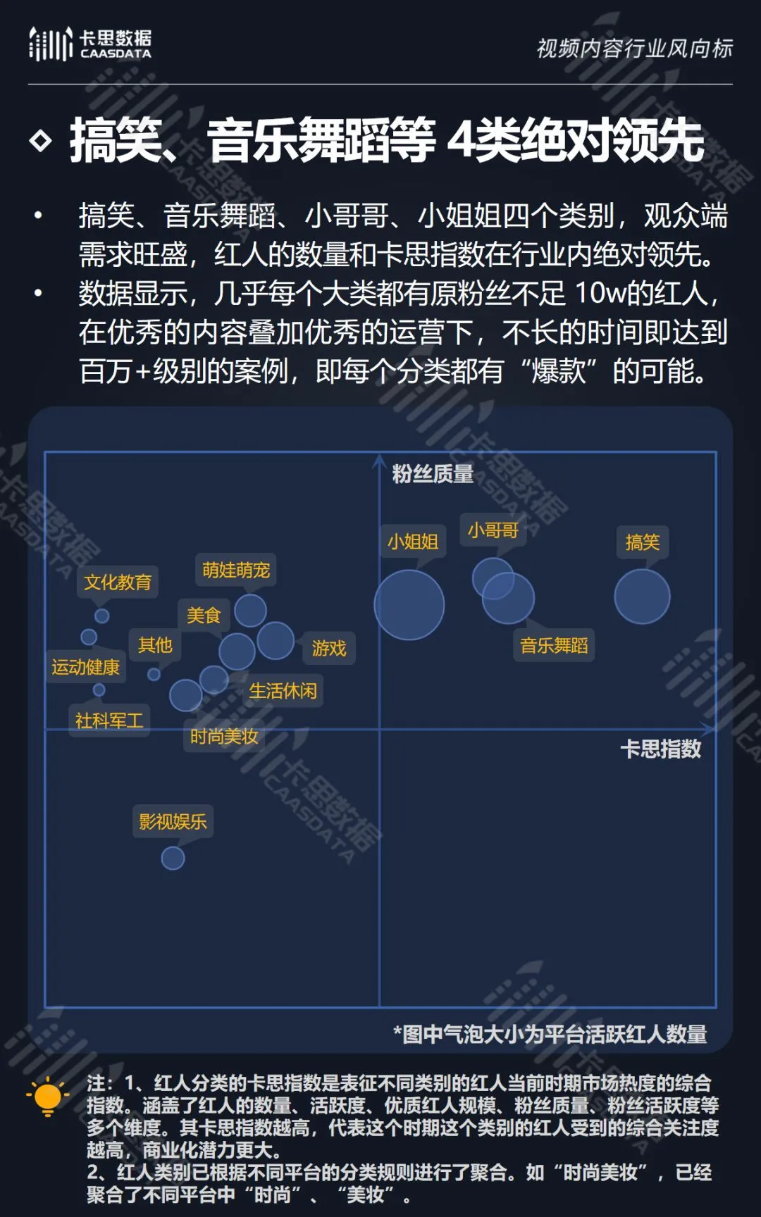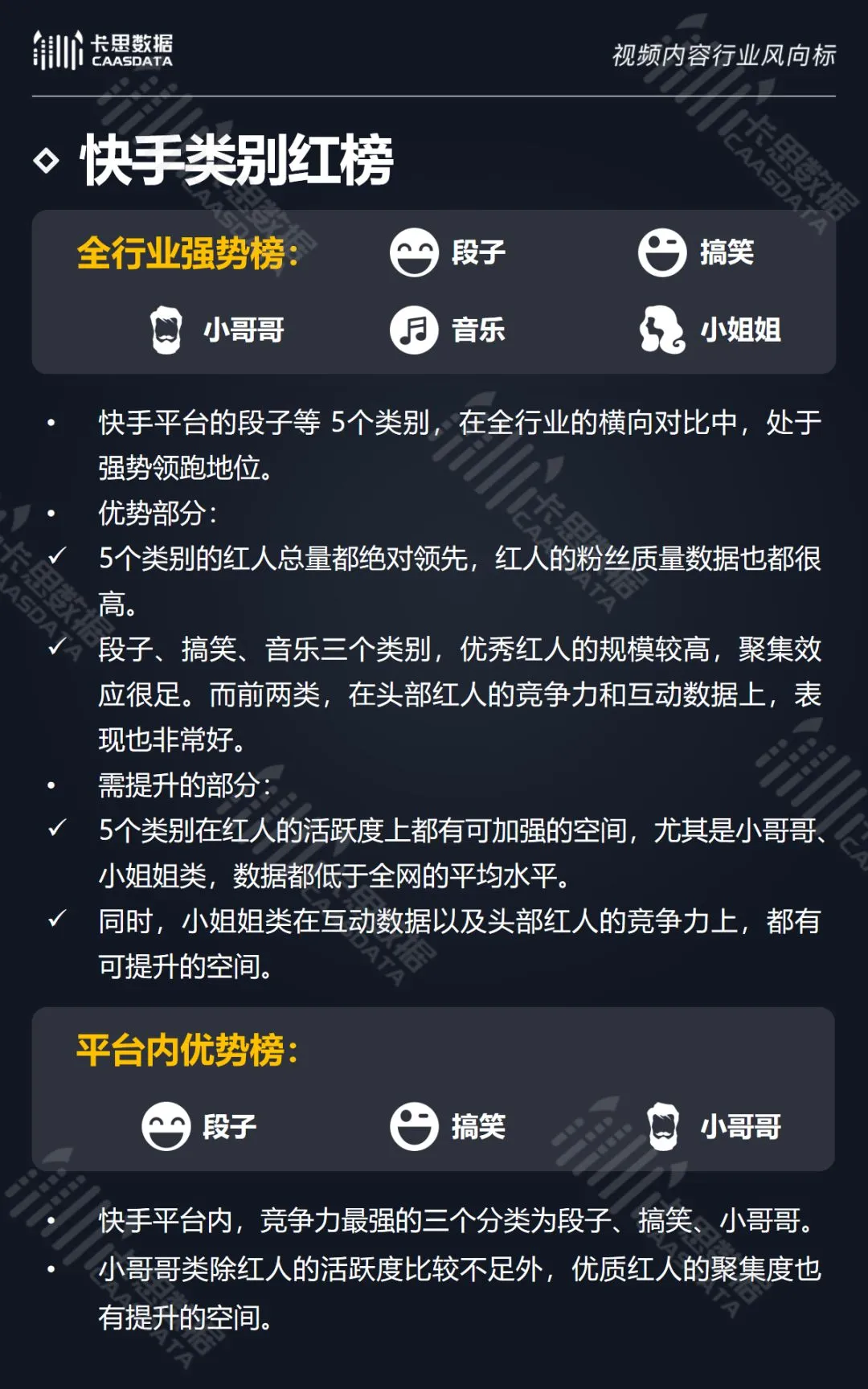 在14个内容分类中,搞笑、音乐舞蹈、小哥哥、小姐姐4类红人的数量和卡思指数在全行业领先。搞笑类四项指标(卡思指数、红人数量、粉丝质量、互动度)接近满分,强势领跑。小哥哥类各项指标表现最为均衡。萌娃萌宠、游戏、美食3类提升空间较大。而用户需求较小的垂类,红人数量少,优质内容严重不足。