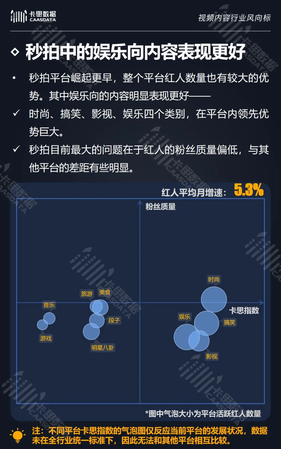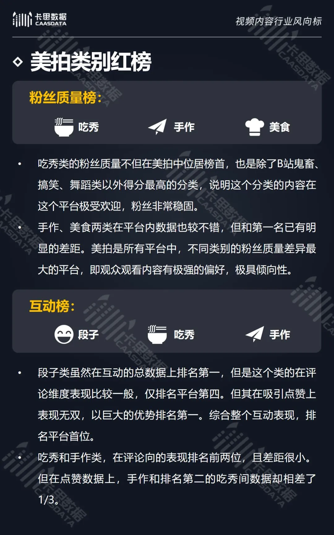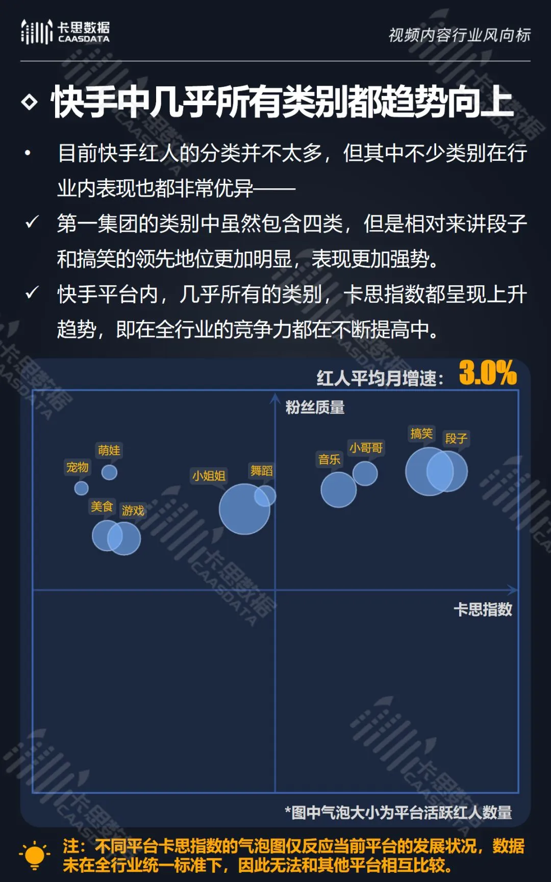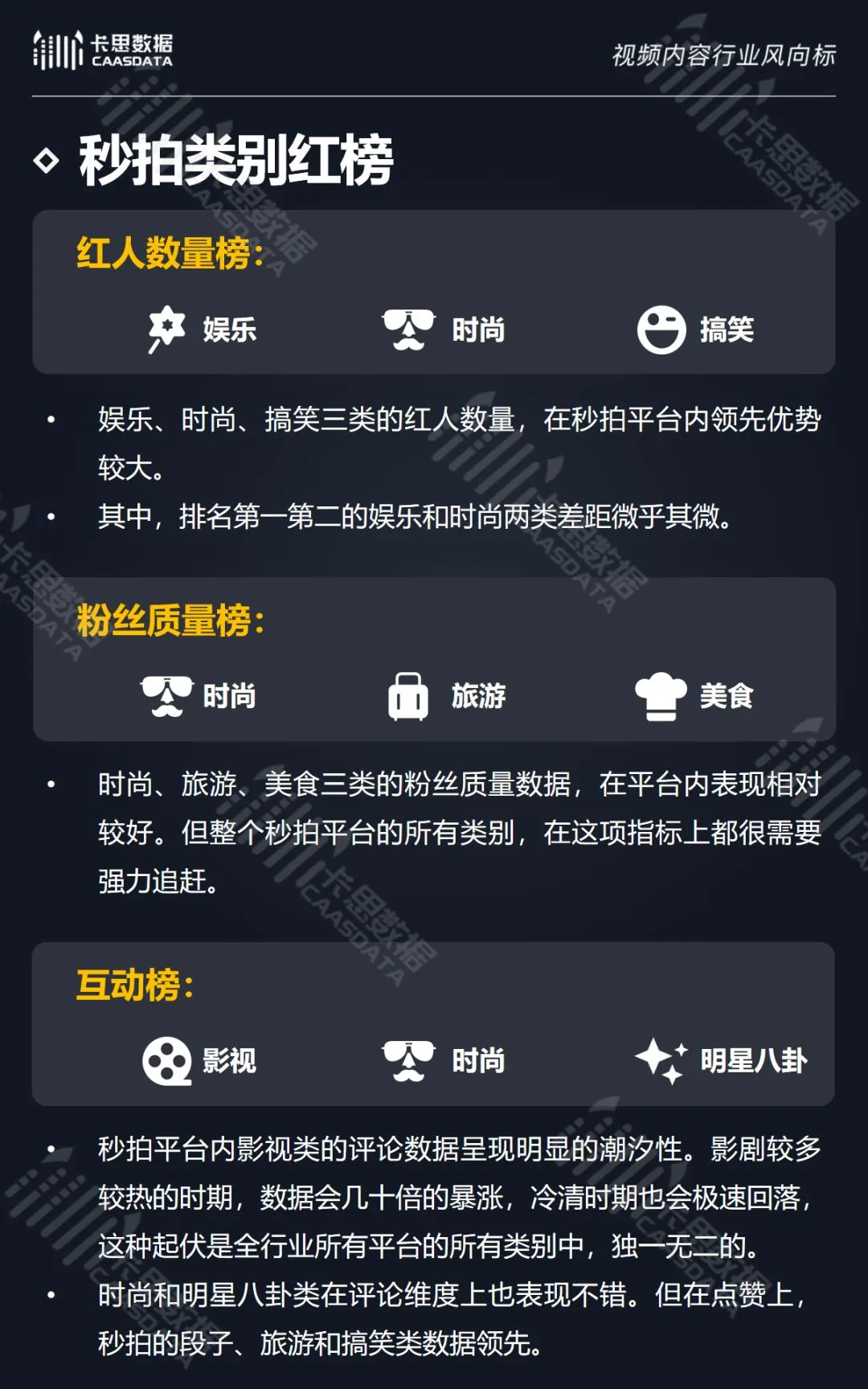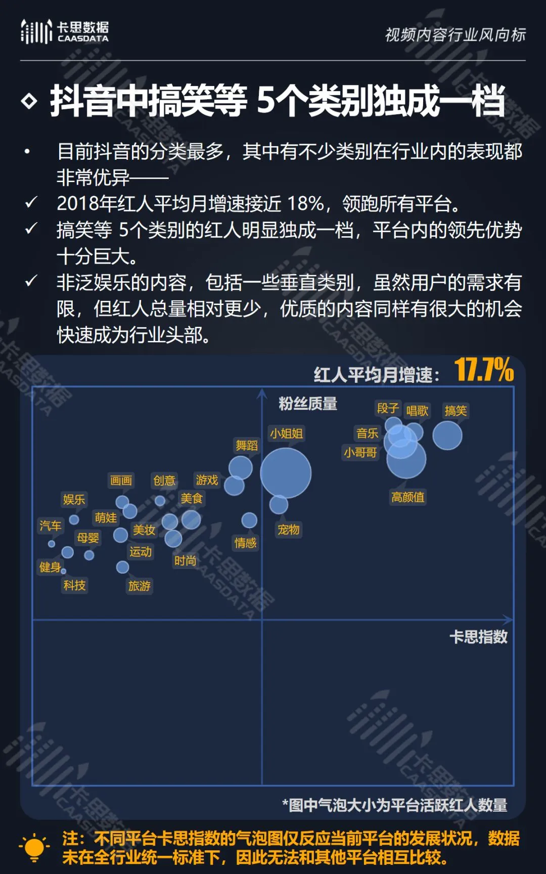 在14个内容分类中,搞笑、音乐舞蹈、小哥哥、小姐姐4类红人的数量和卡思指数在全行业领先。搞笑类四项指标(卡思指数、红人数量、粉丝质量、互动度)接近满分,强势领跑。小哥哥类各项指标表现最为均衡。萌娃萌宠、游戏、美食3类提升空间较大。而用户需求较小的垂类,红人数量少,优质内容严重不足。