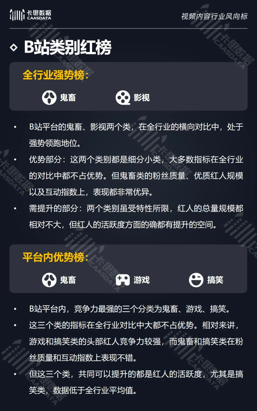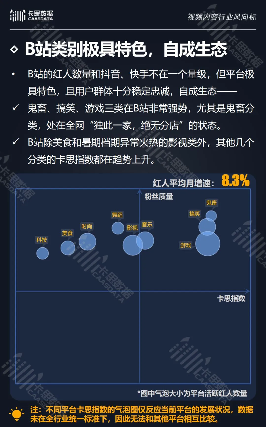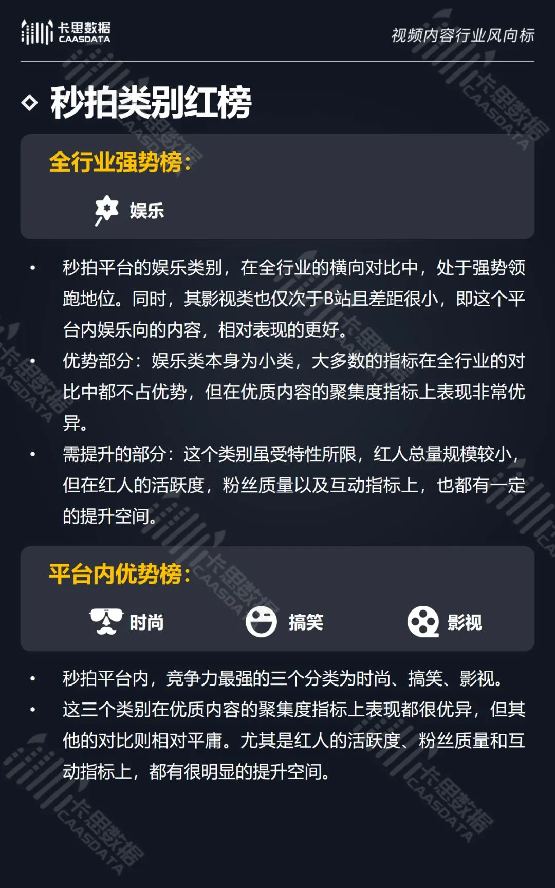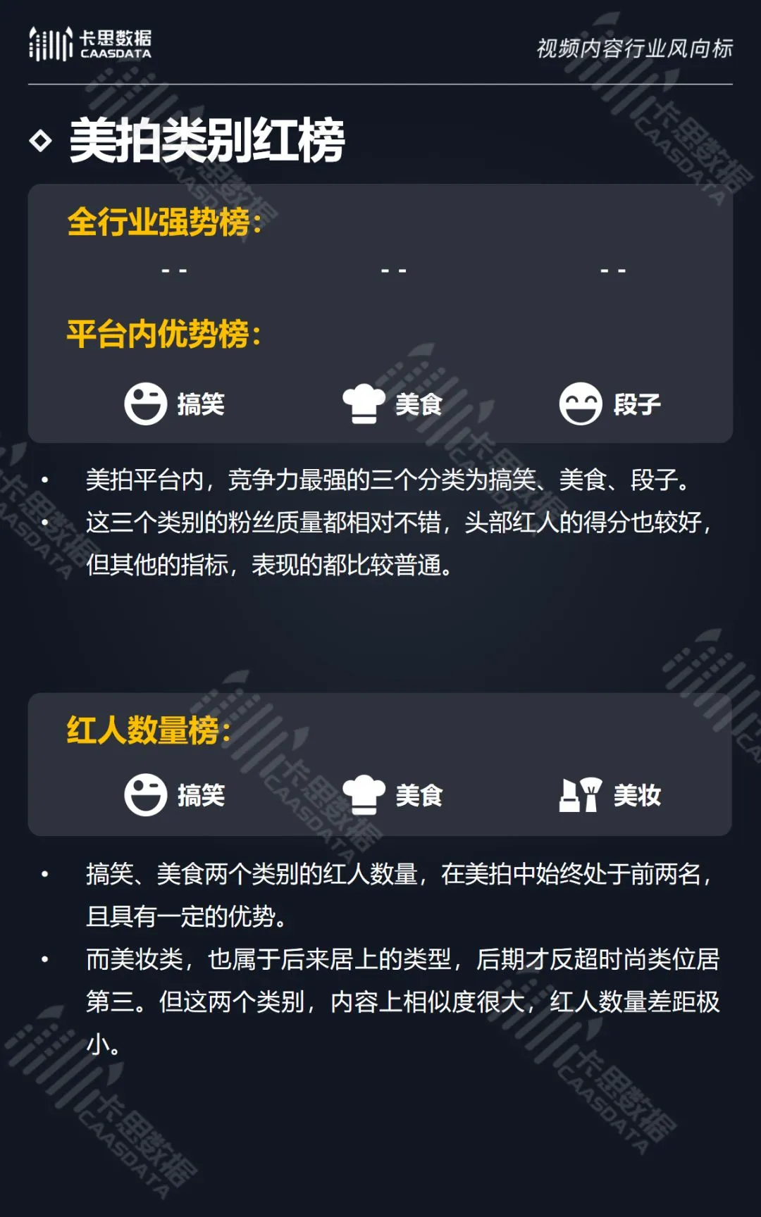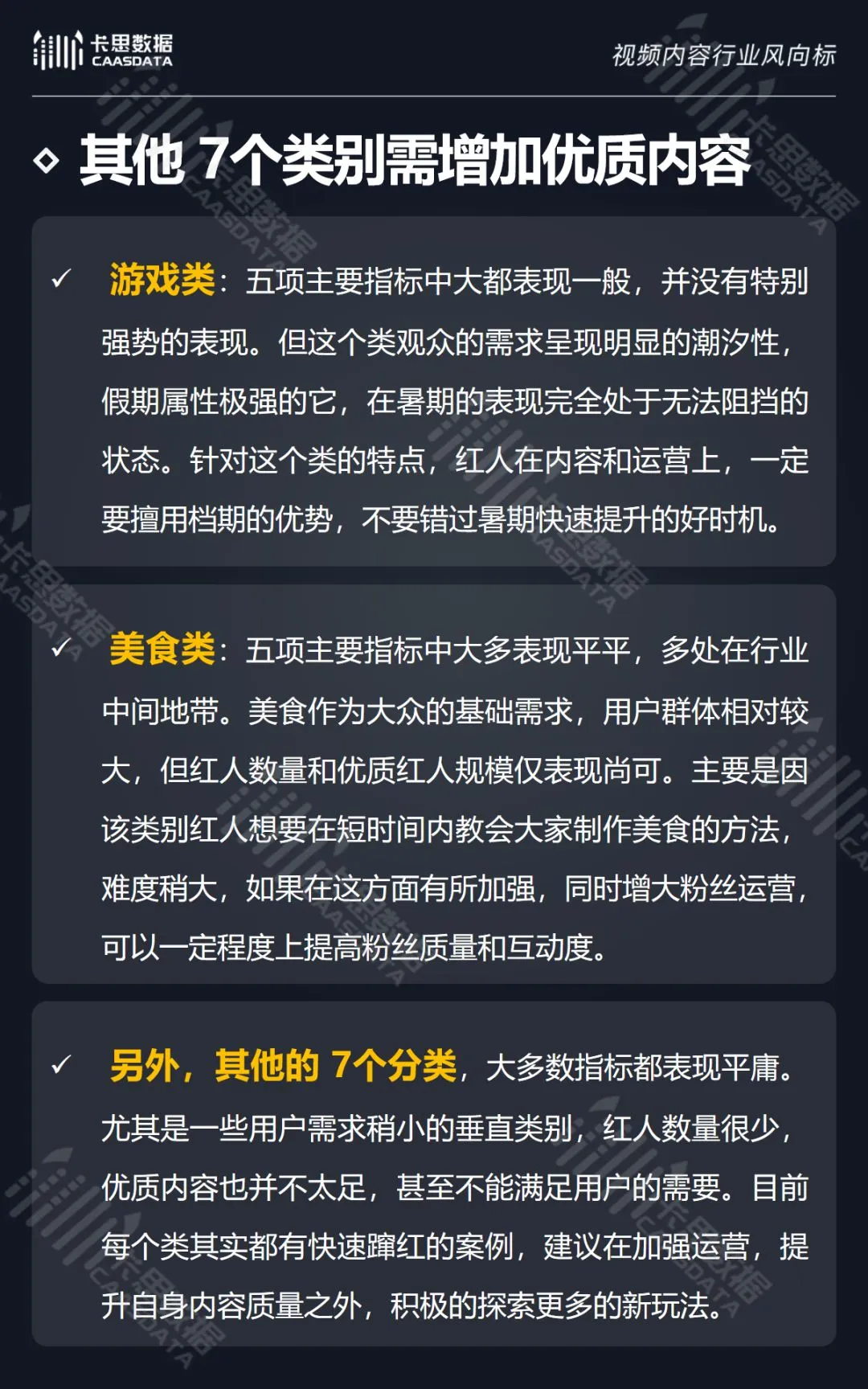 在14个内容分类中,搞笑、音乐舞蹈、小哥哥、小姐姐4类红人的数量和卡思指数在全行业领先。搞笑类四项指标(卡思指数、红人数量、粉丝质量、互动度)接近满分,强势领跑。小哥哥类各项指标表现最为均衡。萌娃萌宠、游戏、美食3类提升空间较大。而用户需求较小的垂类,红人数量少,优质内容严重不足。