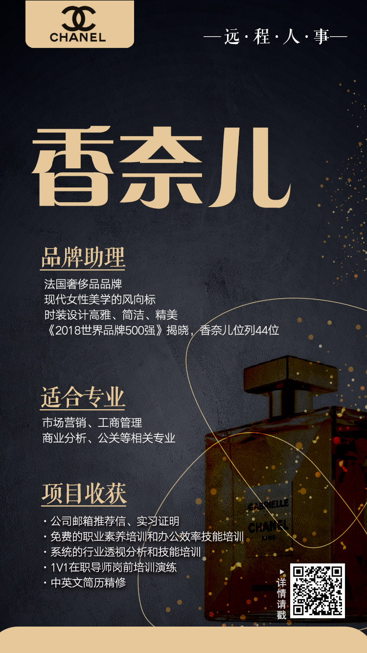 3、香奈儿精英荟萃,能够领域全球化公司的管理理念,洞悉高端消费者的消费心理和趋势,积累行业高端人脉,为未来求职拓宽途径;