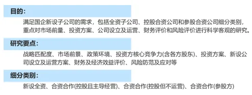 以新公司设立可行性研究为例,主要是满足国企新设子公司的需求,包括全资子公司、控股合资公司和参股合资公司细分类别,重点对市场前量、投资方案、公司设立及运营、财务评价和风险评价进行科学客观的研究。