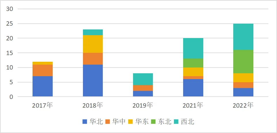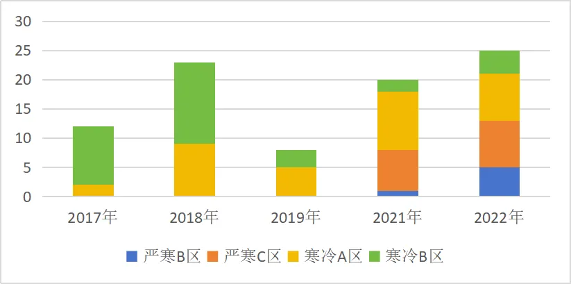 按照《民用建筑热工设计规范》GB50176,根据采暖度日数HDD18将我国严寒寒冷地区细分为5个二级区划。从气候分区角度来看,2017年—2019年,国家北方地区冬季清洁取暖工作覆盖范围仅包含寒冷A区与寒冷B区,2021年后 ,随着清洁取暖城市范围向东北、西北地区进一步扩大,严寒B区与严寒C区城市逐步纳入中央财政支持改造范围。