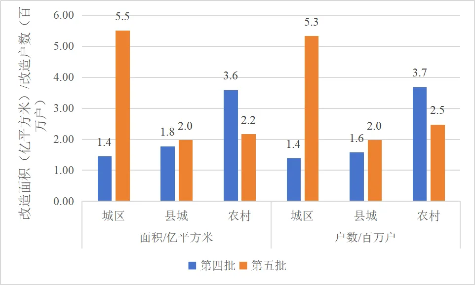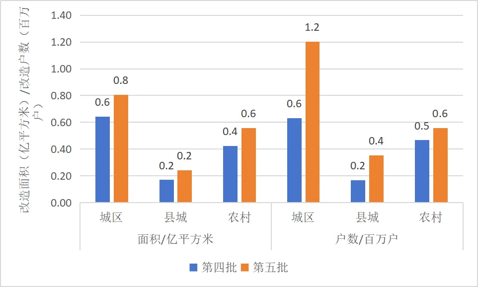 截至2024年9月,第五批项目城市2022—2023年共完成建筑节能改造1.6亿平方米、211万户。其中,城区完成8062万平方米、120万户;县城完成2412万平方米、35万户;农村完成5584万平方米、56万户。城区建筑节能比率(改造任务完成比例)平均81.1%,其中沈阳、长春、齐齐哈尔、哈尔滨已提前完成改造任务;县城建筑节能比率平均87.7%,其中沈阳、长春、昌吉已提前完成改造任务;农村建筑节能比率平均63.3%。