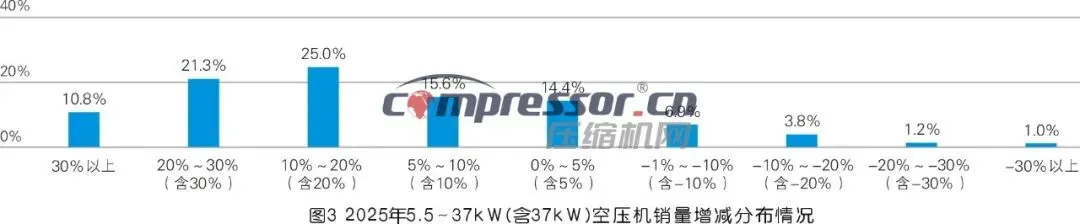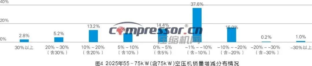 图3显示了2025年压缩机行业5.5~37kW空压机销量增长的分布特征,整体呈普遍增长、中高增长集中的态势。数据显示,正增长为绝对主流:认为2025年该功率段空压机销量实现30%以上增长的人数占比为10.8%,认为销量增长20%~30%(含30%)的人数占21.3%,认为增长10%~20%(含20%)的人占25.0%,三者人数合计57.1%;认为增长5%~10%(含10%)的人占15.6%,认为增长0%~5%(含5%)的人占14.4%,低增长企业合计30.0%。认为负增长的人数仅占12.9%,其中认为增长率为-1%~-10%(含-10%)的人占6.9%,认为销量下滑超10%的人数合计占6.0%。综合问卷调研与定向调研判断,2025年7.5~37kW(含37kW)功率段空压机行业整体销量同比增长15%左右。