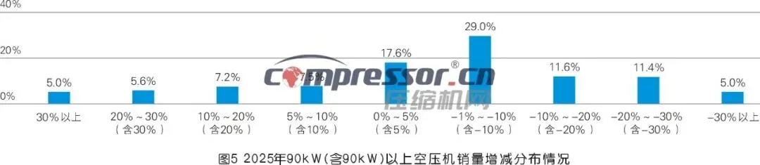 90kW(含90kW)以上功率段空压机销量与55~75kW(含75kW)功率段数据相似:认为实现30%以上高增长的人数仅占5.0%,认为增长了20%~30%(含30%)的人占5.6%,认为增长了10%~20%(含20%)的人数占7.2%,认为增长了5%~10%(含10%)、0%~5%(含5%)的人分别占7.6%、17.6%,正增长企业合计仅约43.0%。认为负增长的占比高达57.0%,其中认为下滑1%~10%(含10%)的人数占29.0%,认为销量下滑30%以上的人数占比依然有5.0%。参考定向调研数据,我们认为2025年90kW(含90kW)以上功率范围空压机的销量同比下滑约5%~10%,可取中间数8%。