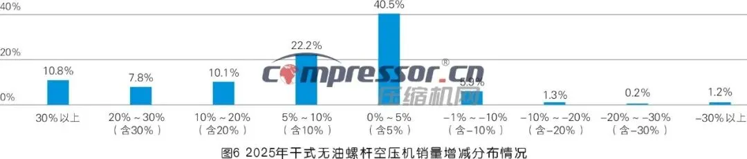 该项调研数据整体呈“普遍正增长、中低增长集中”态势,反映下游电子、新能源、医药、食品等对无油压缩空气的刚需增长,也印证了高端制造领域产能扩张对干式无油螺杆机的需求拉动,行业景气度显著。综合判断,预计干式无油螺杆空压机销量行业同比增长约5%。