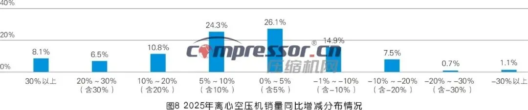 从调研数据看,2025年离心压缩机(含传统型、磁浮、空浮)销量略有增长。数据显示,认为销量正增长的人数比例占主导:其中认为销量实现0%~5%(含5%)增长的人数占比最高,达26.1%,其次为认为增长了5%~10%(含10%)。认为实现正增长的人数占比超过70%。综合来看,2025年离心压缩机(含传统型、磁浮、空浮)销量同比增长约5%。亮点之一是约有8.1%的人认为有超30%以上的增长,可能与个别企业、个别机型表现较好有关。