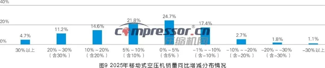 调研数据显示,2025年移动式空压机销量与2024年基本持平,略有增长:认为销量实现0%~5%(含5%)增长的人数占比最高(24.7%)。移动空压机主要应用于矿山钻爆、打井钻探、管道梳理、船舶修造、交通基建、市政工程等场景。2025年,超长期特别国债支持设备更新的资金全部下达,重点投向农业、水利、市政等领域,项目分散、审批快、资金到位有保障;造船业三大指标继续领跑全球,连续16年保持世界第一,这些均利好移动空压机市场。但传统基建和房地产项目依赖地方财政与专项债,2025年新增地方债多用于偿还拖欠账款及历史工程款,形成“实物工作量”的新开工项目资金少于预期。