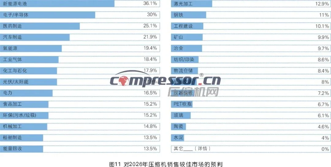 在对2026年压缩机销售较佳市场的预测中,新能源电池、电子/半导体、医药制造、汽车制造、氢能源、工业气体、化工与石化、光伏/太阳能、电力、食品加工等10个行业排名前列。这些行业与2025年销售成绩出色的10个市场基本相符,只是排序有所变化。可以预见,随着AI、大数据的深入发展,电子、半导体产业未来一段时间依旧将高歌猛进。不过,我们也要看到,新能源产业如光伏、锂电池等行业,在“内卷式”发展之后已出现放缓趋势,国家早期出台的扶持政策也逐渐退出。对此市场需求空缺,压缩机行业当早做预案。一方面,要深入挖掘新应用市场,开发新销售区域和渠道;另一方面,需适当控制产能,缩减不必要的成本支出。