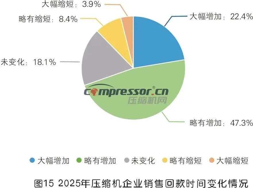 2025年,压缩机行业平均回款时间相比上年度有所增加,认为略有增加占比最高(47.3%),认为大幅增加占22.4%,两者合计69.7%;认为时间未变化的人数占18.1%;认为回款时间缩短的人数仅占12.3%。