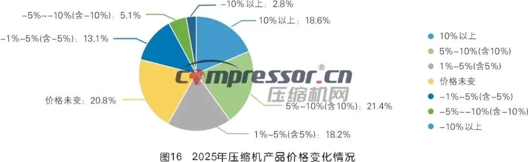 调研数据显示,2025年压缩机产品涨价为主流:认为产品价格上涨1%~5%(含5%)的人数占18.2%,认为上涨5%~10%(含10%)的人数占21.4%(为最高区间),认为上涨10%以上的人数占18.6%,三者合计58.2%;认为价格未变的占20.8%;认为价格负增长(降价)的合计占21.0%。