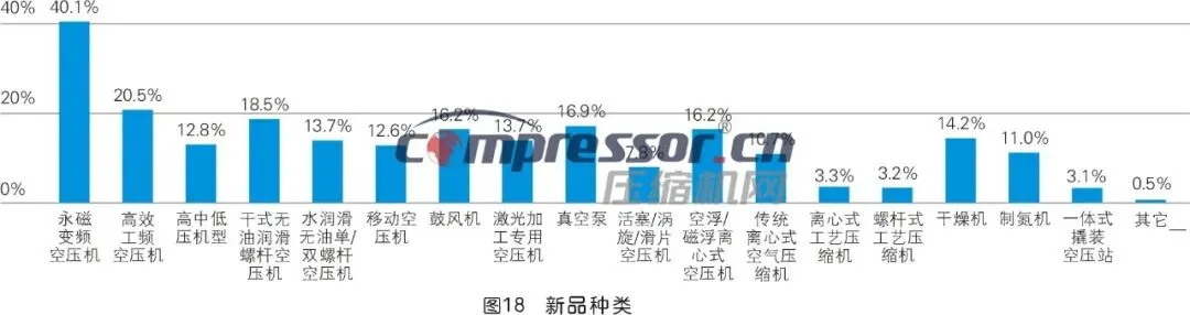 在2025年发布的新品中,40.1%的人表示有永磁变频空压机,排第一,其次为高效工频空压机。比较热门的新品方向还有干式无油润滑螺杆空压机、鼓风机、真空泵、空浮/磁浮离心式空压机等。从趋势看,节能高效(永磁变频、干式无油)、高端技术(空浮/磁浮离心式)、专用场景(激光加工、移动空压机)是新品核心方向:永磁变频因节能需求占比最高,空浮/磁浮离心式瞄准高端制造。