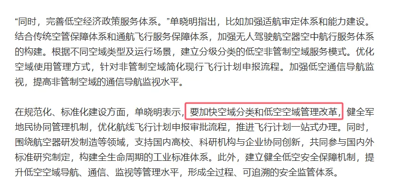 空域是低空经济发展的关键支撑,长期以来,空域划分不明确、审批流程繁琐一直是阻碍行业快速发展的主要瓶颈。在今年全国两会上,空域管理改革成为低空经济领域的核心议题。