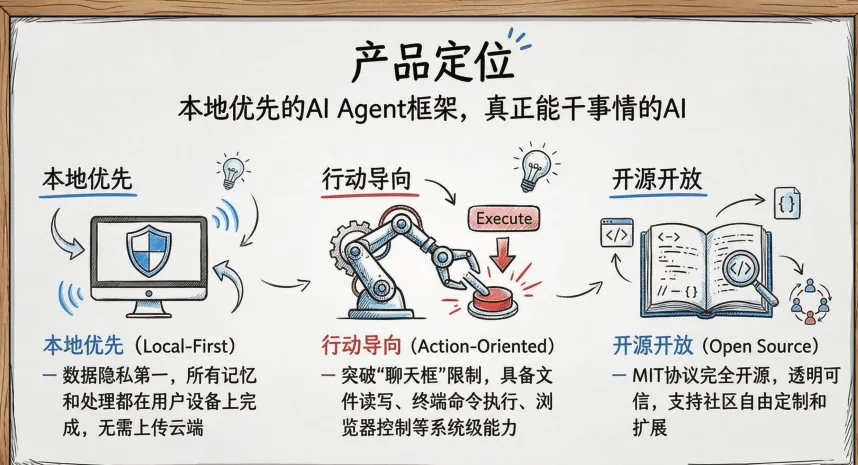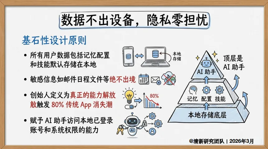 最狠的是本地优先设计:所有数据、记忆、配置都存你电脑里,敏感信息不出境。创始人甚至放话:“这会触发80%的传统APP消失”。