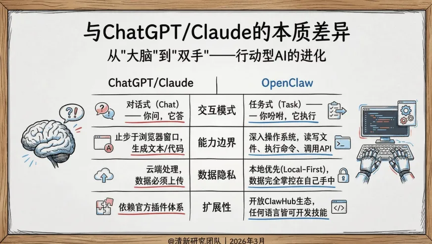它是一个 “本地优先的行动型AI助手框架”。大白话说:一个装在你自己电脑里,能听懂人话,并且能亲自上手帮你干活的AI。ChatGPT只能聊天,OpenClaw能动手。