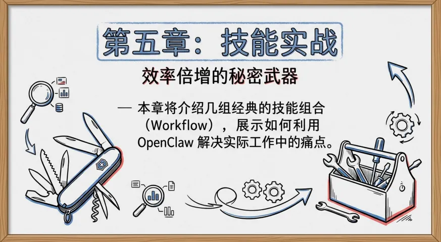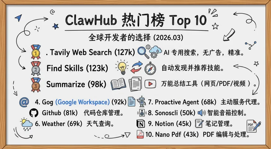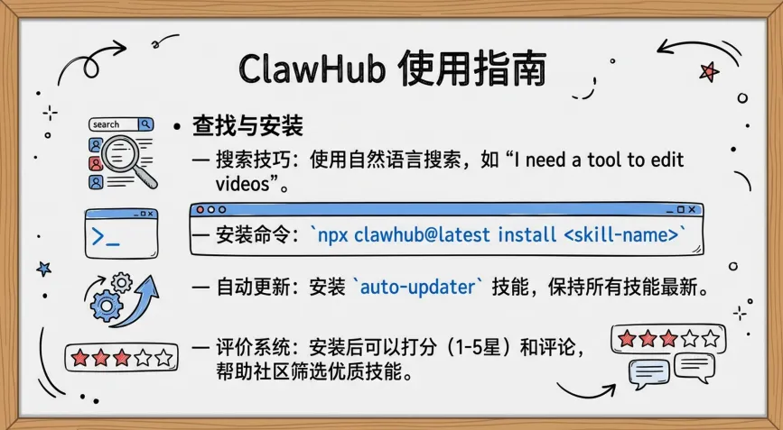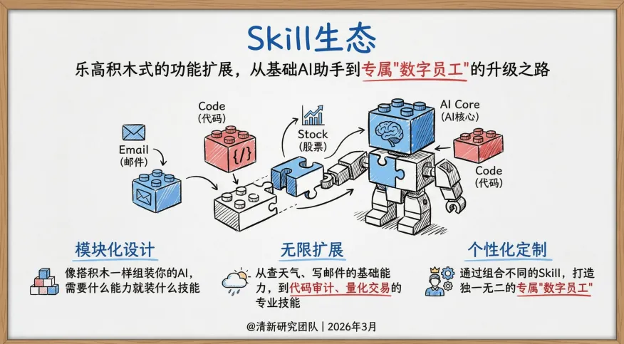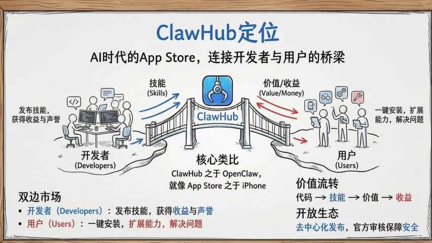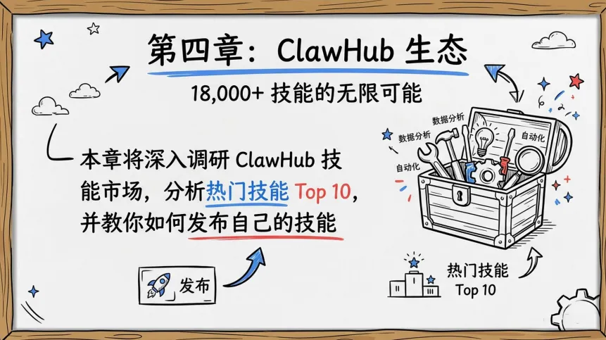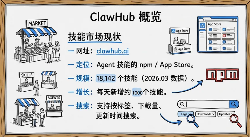 OpenClaw还有个叫ClawHub的技能市场,现在已经18000+技能。你可以像装App一样给AI装能力: