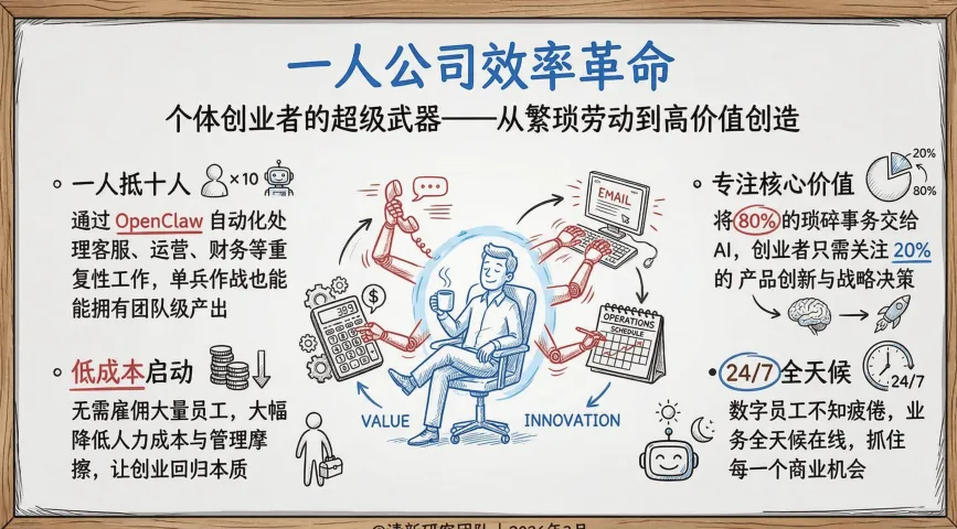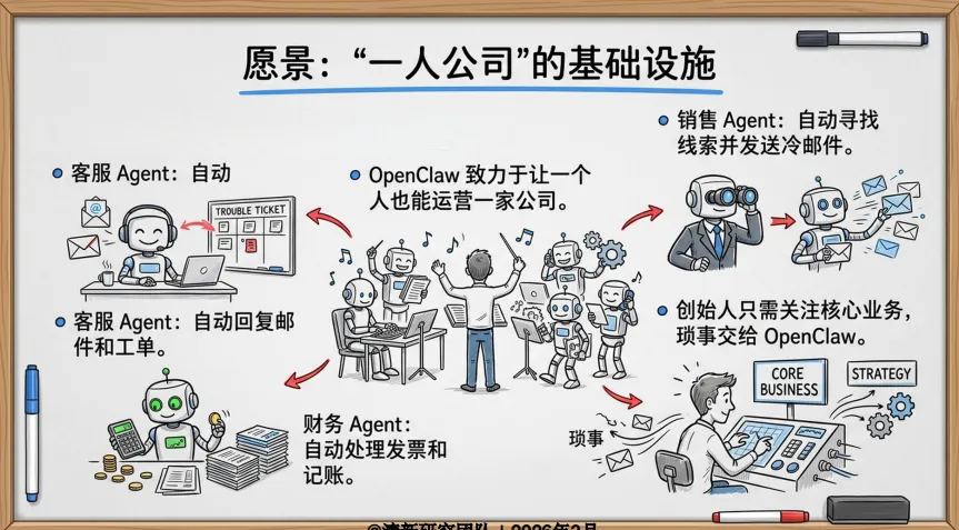 ? 创业者梦之队: 这就是“一人公司”的终极形态。让OpenClaw帮你自动回复客服邮件、处理发票记账、寻找销售线索。你一个人,加上这个AI“数字员工”,就能撑起一家公司。