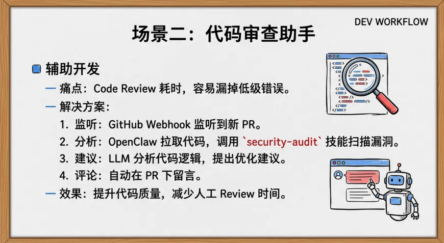 ? 审代码?它监听到PR更新,自动拉代码跑安全扫描,在评论区贴建议