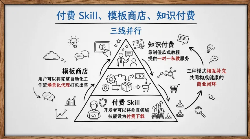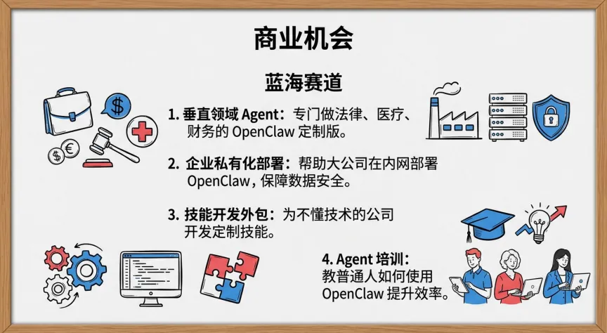 报告提到,已经有独立开发者靠OpenClaw实现年入百万——开发付费技能、企业定制、模板商店,变现路径相当清晰。